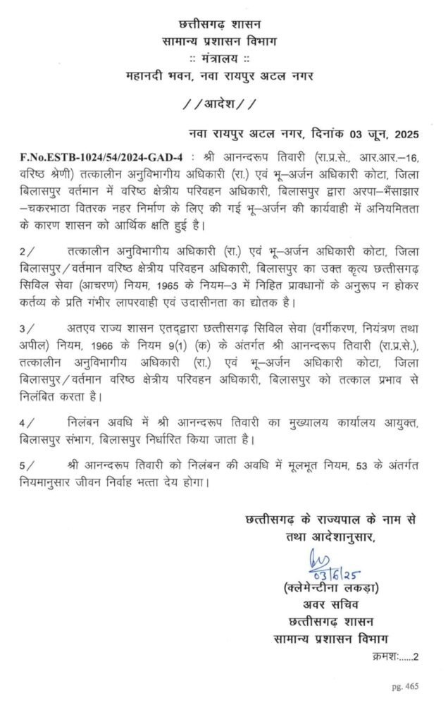 रायपुर। अरपा भैंसाझार परियोजना में 4 करोड़ रुपए की गड़बड़ी के मामले में एक्शन लेते हुए सरकार ने कोटा के तत्कालीन SDM आनंदरूप तिवारी को निलंबित कर दिया है। यह कार्रवाई भू – अर्जन में अनियमितता और अरपा-भैंसाझार नहर निर्माण में गड़बड़ी को लेकर की गई है। आनंदरूप तिवारी भू अर्जन के समय एसडीएम थे।