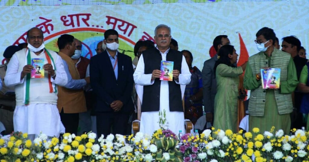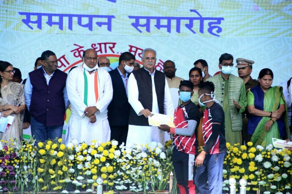 मुख्यमंत्री श्री बघेल ने पण्डित माधवराव सप्रे के 100 वर्ष पुराने लेखों के संग्रह की पुस्तिका का विमोचन किया और जिले के स्थापना दिवस के अवसर पर आयोजित विभिन्न प्रतियोगिताओं के विजेताओं को सम्मानित किया।