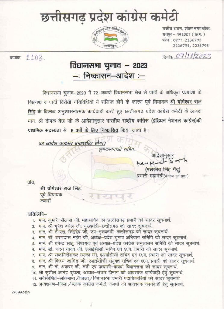 विधानसभा चुनाव में कवर्धा के कांग्रेस प्रत्याशी के खिलाफ और  पार्टी विरोधी गतिविधियों में शामिल होने के कारण कवर्धा के पूर्व विधायक योगेश्वर राज सिंह को कोंग्रेस पार्टी की प्राथमिक सदस्यता से छह वर्ष के लिए निष्कासित कर दिया गया है।अनुशासनात्मक कार्यवाही करते हुए प्रदेश कांग्रेस अध्यक्ष दीपक बैज के आदेशानुसार ये कार्यवाही की गई  हैं।योगेश्वर राज ऊर्फ योगीराज सिंह ने कवर्धा सीट पर चुनाव में आप पार्टी के प्रत्याशी खड़ग राज सिंह का खुलेआम प्रचार किया था। यहां पर कांग्रेस से मंत्री मोहम्मद अकबर प्रत्याशी थे।मतदान होने के बाद ये आदेश जारी किया गया है।