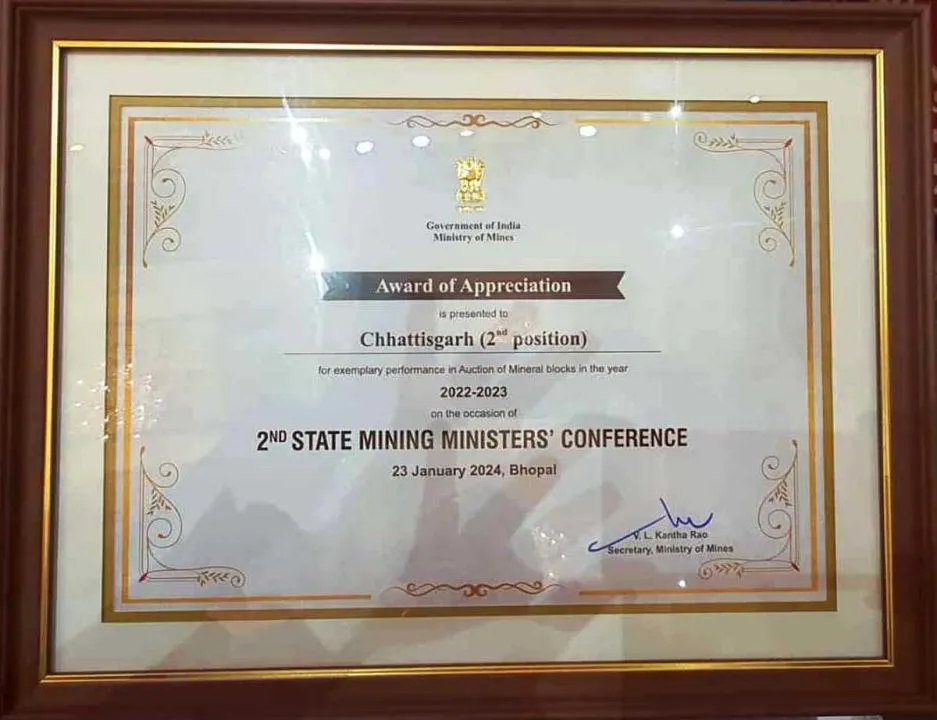 रायपुर: छत्तीसगढ़ राज्य को गैर कोयला मुख्य खनिज ब्लॉकों की नीलामी के लिए एक और राष्ट्रीय पुरस्कार मिला है। केन्द्रीय कोयला एवं खान मंत्री प्रहलाद जोशी ने आज मध्यप्रदेश की राजधानी भोपाल में आयोजित राज्य खनन मंत्री सम्मेलन में गैर कोयला मुख्य खनिज ब्लॉकों की सफलतापूर्वक नीलामी के लिए छत्तीसगढ़ को देशभर में द्वितीय बेस्ट परफॉर्मेंस अवार्ड से नवाजा है। यह पुरस्कार भारत सरकार के खनन मंत्रालय द्वारा दिया गया है। मुख्यमंत्री विष्णु देव साय ने इस उपलब्धि के लिए खनिज विभाग के सभी अधिकारियों को बधाई और शुभकामनाएं दी हैं।