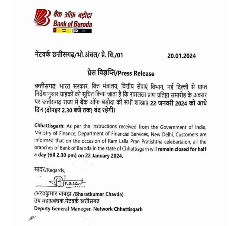 रायपुर। छत्तीसगढ़ में बैंक ऑफ बड़ौदा की सभी शाखाएं 22 जनवरी को आधे दिन बंद रहेंगी। उप महाप्रबंधक भरतकुमार चावड़ा ने विज्ञप्ति जारी कर बताया कि भारत सरकार, वित्त मंत्रालय, वित्तीय सेवाएं विभाग, नई दिल्ली से प्राप्त निर्देशानुसार ग्राहकों को सूचित किया जाता है कि रामलला प्राण प्रतिष्ठा समारोह के अवसर पर छत्तीसगढ़ राज्य में बैंक ऑफ बड़ौदा की सभी शाखाएं 22 जनवरी 2024 को आधे दिन (दोपहर 2.30 बजे तक) बंद रहेगी।