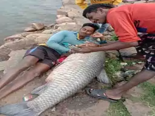 कवर्धा जिले के बोड़ला ब्लॉक अंतर्गत सरोधा जलाशय में शाम को मछली पकड़ने के दौरान मछुआरों के जाल में एक बड़ी मछली फंसी, जिसका वजन 80 किलो और लंबाई 6 फिट बताई जा रही है। मछली मिलने के बाद मछली की फोटो सोशल मीडिया पर वायरल हो गई। देखने के लिए लोगों की भीड़ सरोधा पहुंच गई। बताया जा रहा कि 200 एकड़ में फैले इस सरोधा जलाशय में बहुत से अलग-अलग प्रजाति की मछलियां मिलती हैं। अब तक जलाशय में 40 किलोग्राम तक की ही मछली जाल में फंसी थी, लेकिन सोमवार को सुबह जाल फेंकने के बाद शाम को 80 किलो की मछली मिली।