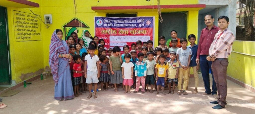 दुर्ग। भारती विश्वविद्यालय दुर्ग द्वारा गोदग्राम कोनारी तथा पीसेगांव में विविध आयोजन किए गए। सर्वप्रथम गोद ग्राम कोनारी में पोषण आहार जागरूकता कार्यक्रम आंगनबाड़ी केंद्र में आयोजित किया गया। उक्त आयोजन में विश्वविद्यालय के समाजशास्त्र विभाग के विभागाध्यक्ष डॉ स्नेह कुमार मेश्राम ने प्रोटीन, विटामिन तथा खनिज लवणों से भरपूर खाद्य पदार्थों की जो ग्रामीण स्तर के बच्चों की पहुंच में हो, के संबंध में जानकारी प्रदान की। कार्यक्रम में आंगनबाड़ी कार्यकर्ताओं तथा सहायिकाओं सहित बड़ी संख्या में ग्रामीण बच्चे सम्मिलित हुए। साथ ही विश्वविद्यालय द्वारा ग्रामीण बच्चों का शिक्षा के प्रति उत्साह बढ़ाने के लिए नि:शुल्क स्टेशनरी प्रदान की गई जिससे बच्चे हर्षित हुए। गोदग्राम ग्राम पंचायत कोनारी के पंचायत भवन में सरपंच श्री भरत लाल चंद्राकर के साथ ग्रामीण विकास के विभिन्न मुद्दों पर बैठक का आयोजन किया गया।