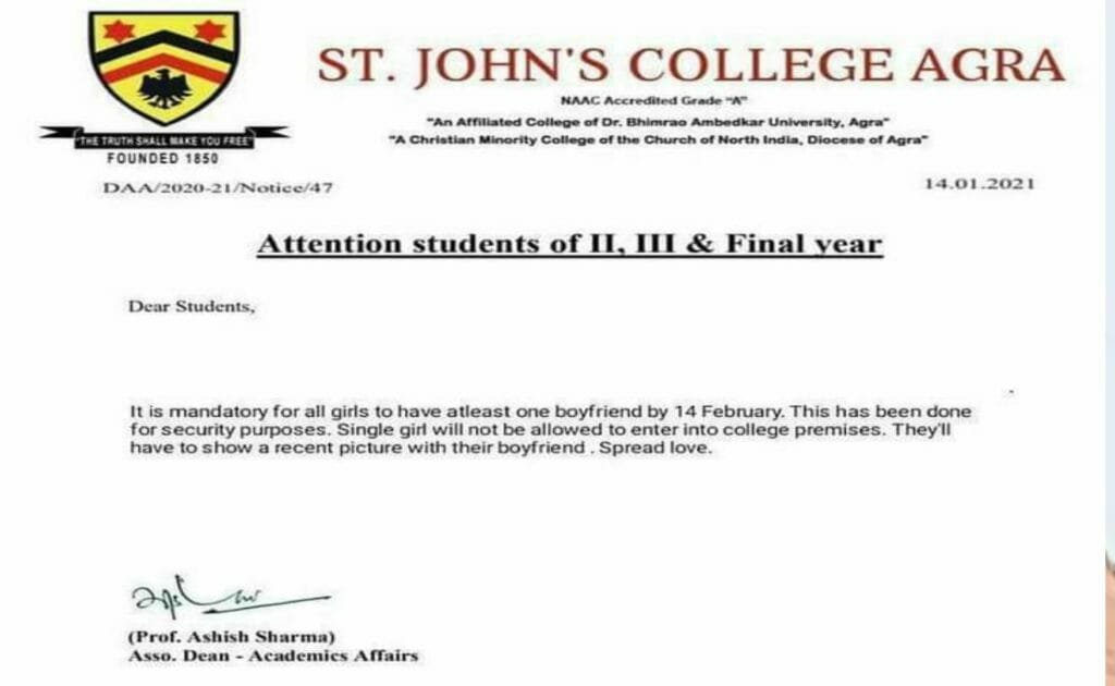 सोमवार को सेंट जोंस कालेज के एसोसिएट डीन (एकेडमिक अफेयर्स) प्रो. आशीष शर्मा का एक पत्र इंटरनेट मीडिया पर वायरल हुआ। इस पत्र में निर्देश दिए गए कि कालेज की द्वितीय व अंतिम वर्ष की छात्राओं को 14 फरवरी यानी वेलेंटाइन डे तक बायफ्रेंड बनाना है। जैसे ही इस लेटर की जानकारी कॉलेज के साथ में छात्र-छात्रों को हुई तो यह लैटर चर्चा का विषय बन गया, कॉलेज की छात्राएं भी सहमी हुई सी नजर आई।