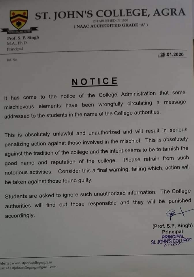 कॉलेज की लेटर हेड पर वायरल हुए पत्र को लेकर कालेज के प्राचार्य डा. एसपी सिंह की सफाई भी सामने आई है। उन्होंने साफ कहा कि कालेज में प्रो. आशीष शर्मा नाम का कोई भी शिक्षक नहीं है। उन्होंने कॉलेज की ओर से स्पष्टीकरण पत्र में कहा गया है कि यह पत्र फर्जी है। जिसने भी यह काम किया है, उसके खिलाफ अनुशासनात्मक कार्रवाई की जाएगी। ऐसा ही एक फर्जी पत्र दयालबाग शिक्षण संस्थान में भी जारी हुआ है।