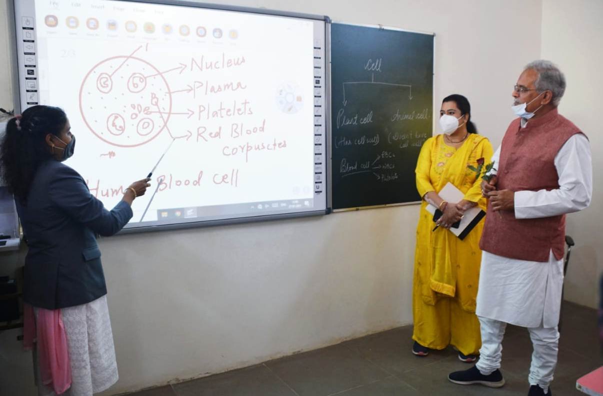 मुख्यमंत्री श्री बघेल ने इंग्लिश मीडियम स्कूल के अवलोकन के दौरान विभिन्न कक्षाओं में जाकर विद्यार्थियों तथा शिक्षकों से स्कूल में अध्ययन-अध्यापन के बारे में चर्चा की। अध्ययनरत स्कूली बच्चों ने मुख्यमंत्री से अंग्रेजी में बातचीत की तथा उन्हें पोयम भी सुनायें। मुख्यमंत्री ने डिजिटल क्लास रूम में बच्चों को पढ़ते देख अपने पढ़ाई के दिनों को याद करते हुए कहा हमने ब्लैक बोर्ड डस्टर में पढ़ाई की थी, लेकिन अब हमारी नई पीढ़ी डिजिटल क्लास रूम में पढ़ने की सुविधा मिली है। इस अवसर पर कांकेर जिले के प्रभारी एवं ग्रामोद्योग मंत्री गुरू रूद्र कुमार, परिवहन, आवास, पर्यावरण एवं वन मंत्री श्री मो. अकबर, आबकारी एवं उद्योग मंत्री श्री कवासी लखमा, छत्तीसगढ़ विधानसभा के उपाध्यक्ष श्री मनोज सिंह मण्डावी, संसदीय सचिव श्री शिशुपाल शोरी, कोण्डागांव विधायक श्री मोहन मरकाम, अंतागढ़ विधायक श्री अनूप नाग, केशकाल विधायक संतराम नेताम, मुख्यमंत्री के सलाहकार श्री राजेश तिवारी, अनुसूचित जनजाति आयोग के सदस्य श्री नितिन पोटाई सहित अन्य जनप्रतिनिधि एवं गणमान्य नागरिक उपस्थित थे।
