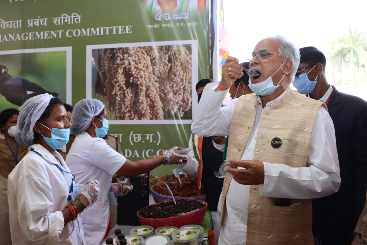 मुख्यमंत्री श्री भूपेश बघेल ने आज दंतेवाड़ा जिले के प्रवास के दौरान तहत आमसभा स्थल पर विभागीय स्टालों के निरीक्षण के दौरान महिला समूहों द्वारा महुआ से बनाए गए हलवा और कुकीज का स्वाद लिया और इसकी प्रशंसा की। मुख्यमंत्री ने समूह की महिलाओं से चर्चा कर उनके द्वारा संचालित आर्थिक गतिविधियों के बारे में जानकारी ली।