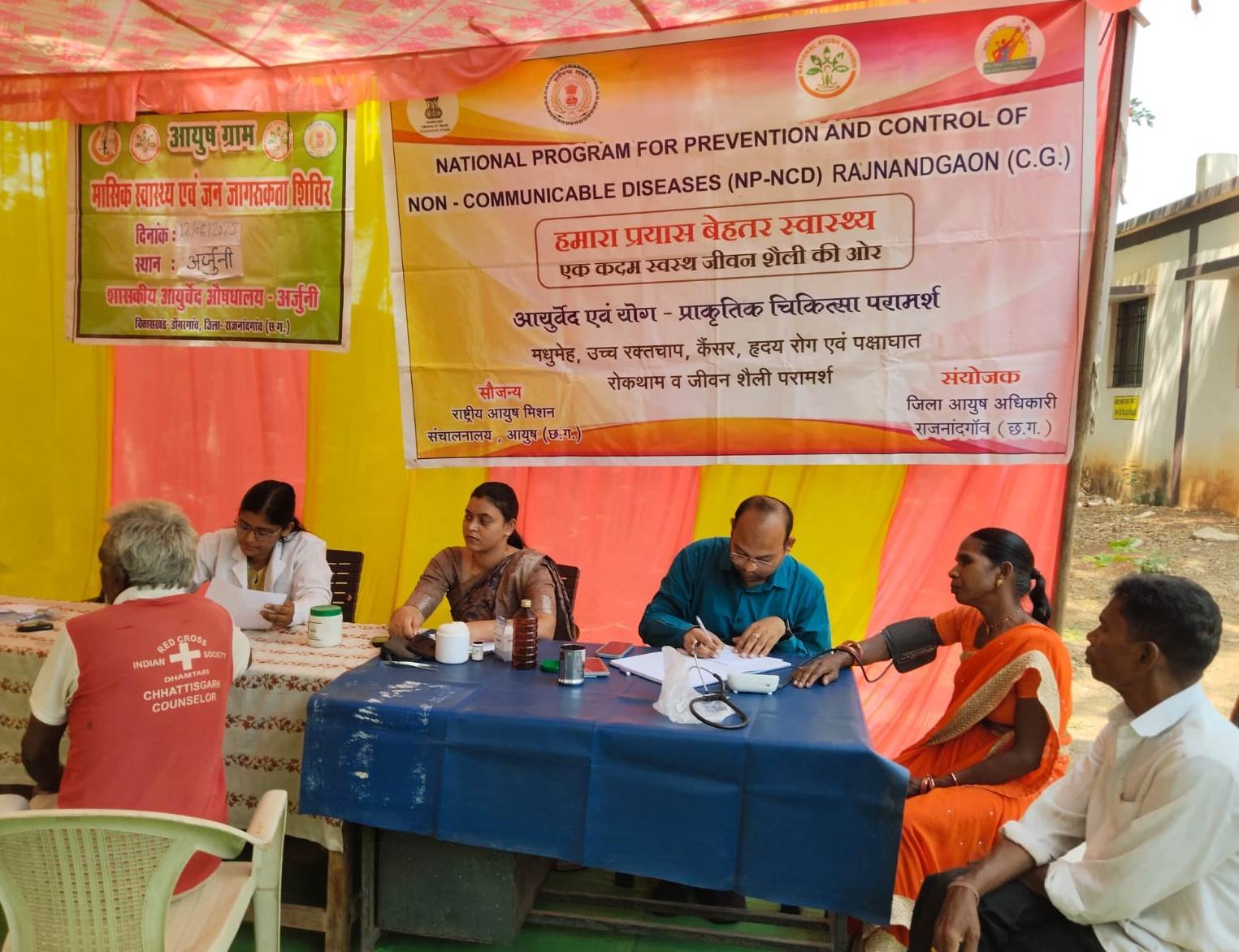 राजनांदगांव । आयुष विभाग द्वारा डोंगरगांव विकासखंड के आयुष ग्राम अर्जुनी में राष्ट्रीय गैर संचारी रोग नियंत्रण कार्यक्रम एवं राष्ट्रीय आयुष मिशन के तहत नि:शुल्क एनसीडी कैम्प एवं जनजागरूकता शिविर का आयोजन किया गया। शिविर में  कुल 69 रोगी लाभान्वित हुए। जिसमें 51 रोगियों की  ब्लड प्रेशर एवं मधुमेह की जांच की गई एवं आहार-विहार की जानकारी दी गई। शिविर में उपस्थित ग्रामीणजनों को गैर संक्रामक रोगों के कारण, लक्षण एवं बचाव के बारे में तथा योग, प्राणायाम, दिनचर्या एवं ऋतुचर्या पालन के संबंध में आवश्यक जानकारी दी गई और औषधि का वितरण किया गया। शिविर में आयुष चिकित्सक डॉ. अनमोल गुप्ता, आयुर्वेद चिकित्साधिकारी डॉ. मधु बंछोर, योग चिकित्सक डॉ. स्नेहा देशमुख, फॉर्मासिस्ट सुनील अग्रवाल, औषधालय सेवक दुजलाल कुंजाम, पीटीएस छबीलाल यादव उपस्थित थे।