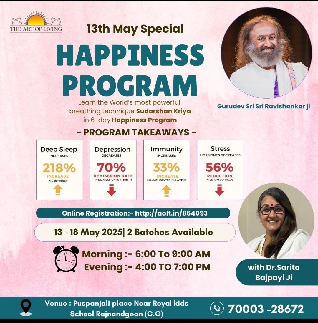 राजनांदगांव | 13 मई से पुष्पांजलि मे पूज्य श्री श्री रविशंकर जी द्वारा स्थापित संस्था आर्ट ऑफ लिविंग परिवार की राजनंदगांव शाखा द्वारा आगामी 13 मई से 18 मई तक हैप्पिनेस प्रोग्राम का आयोजन किया गया है। यह शिविर सुबह 6से 9 एवम् शाम 4 से 7बजे तक पुष्पांजलि पैलेस रॉयल किड्स स्कूल के पास लालबाग राजनंदगांव मे रख गया है।
