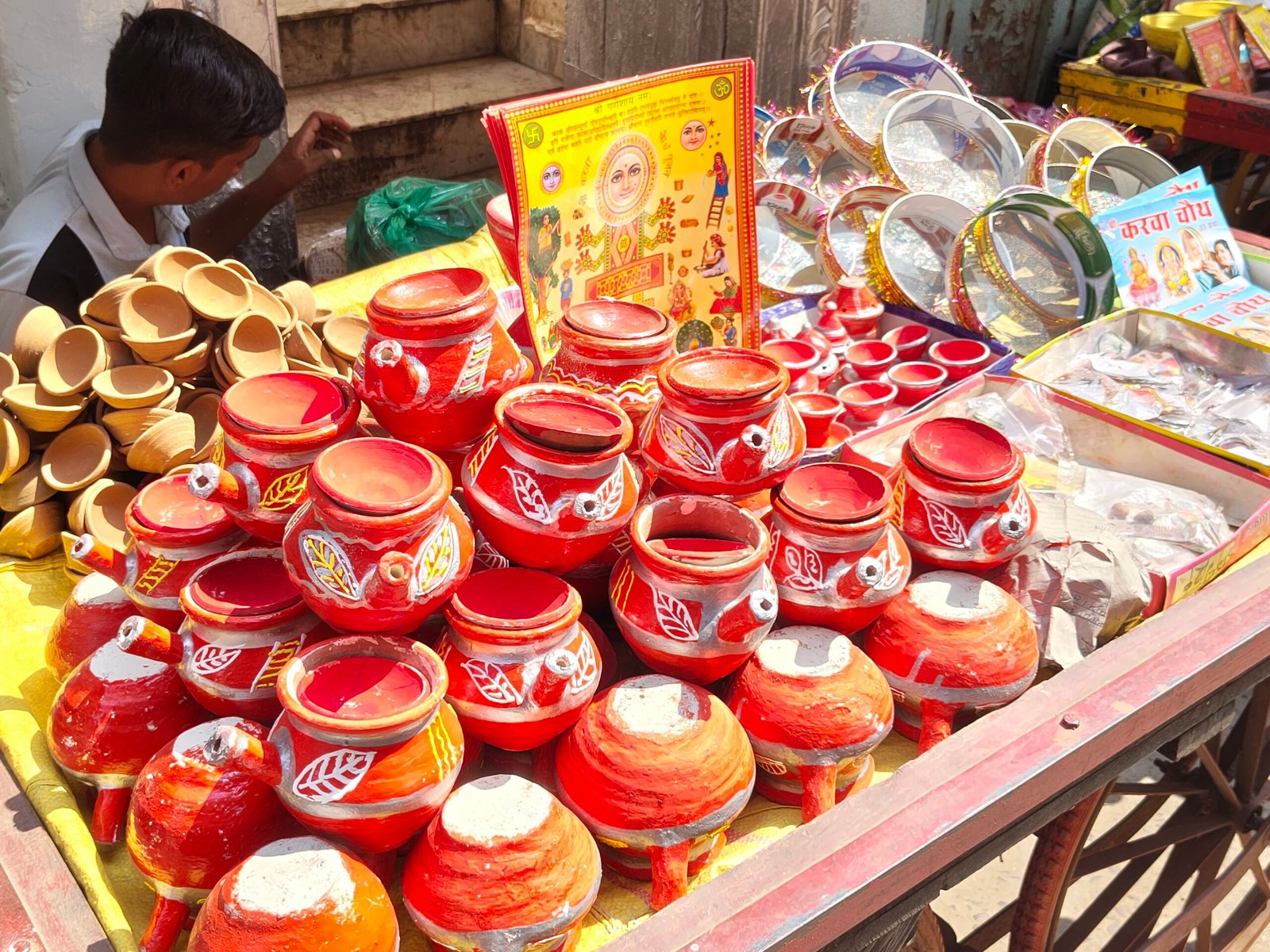 बाजार में विशेष रूप से गोल बाजार ,हंडी पसरा, जयस्तंभ चौक व जूनी हटारी में करवा चौथ से संबंधित पूजन सामग्री मिट्टी के रंग – बिरंगे सजे हुए कलश ,छन्नी आदि बड़ी तादाद में पंहुच गए हैं और ये लोंगों को लुभा भी रहे हैं। छिटपुर तौर से ग्राहकी शुरू हो गई हैं। इस पर्व को लेकर महिलाओं में विशेष उत्साह देखा जा रहा है।