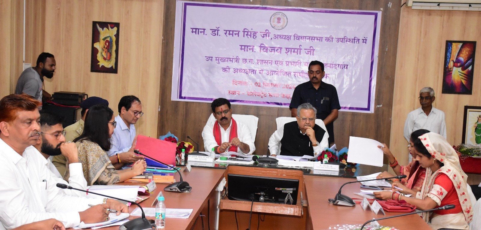 नवाचार के साथ ही गुणवत्तापूर्ण कार्य करें अधिकारी : उप मुख्यमंत्री- विधानसभा अध्यक्ष एवं उप मुख्यमंत्री व जिले के प्रभारी मंत्री ने विभागीय योजनाओं की समीक्षा की- जिले में शहरी एवं ग्रामीण क्षेत्रों में नहीं होनी चाहिए पानी की समस्या- विधानसभा अध्यक्ष ने पुनरूद्धार वितरण क्षेत्र योजना अंतर्गत मद में प्राप्त राशि लैप्स हो जाने के कारण विकास कार्य बाधित होने पर नाराजगी जाहिर की- जल जीवन मिशन योजना क्रियान्वयन होना चाहिए अच्छी तरह- अविवादित नामांतरण एवं बटवारा के प्रकरणों का शत-प्रतिशत निराकरण करने के दिए निर्देश  – समीक्षा के दौरान दिए गए आवश्यक दिशा-निर्देश एवं मार्गदर्शन- अवैध शराब पर कार्रवाई करने के निर्देश दिएराजनांदगांव 01 सितम्बर 2024। विधानसभा अध्यक्ष डॉ. रमन सिंह की उपस्थिति में उप मुख्यमंत्री, गृह, पंचायत एवं ग्रामीण विकास विभाग के मंत्री तथा जिले के प्रभारी मंत्री श्री विजय शर्मा की अध्यक्षता में आज कलेक्टोरेट सभाकक्ष में विभागीय योजनाओं की समीक्षा बैठक आयोजित की गई। इस दौरान सांसद श्री संतोष पाण्डेय,  विधायक डोंगरगढ़ श्री दलेश्वर साहू, जिला पंचायत अध्यक्ष श्रीमती गीता साहू,कलेक्टर श्री संजय अग्रवाल एवं पुलिस अधीक्षक श्री मोहित गर्ग उपस्थित थे। विधानसभा अध्यक्ष डॉ. रमन सिंह ने कहा कि जिले के विकास से संबंधित विभिन्न मुद्दों पर चर्चा हुई और बहुत अच्छे से जिले के विकास कार्यों के संबंध के जानकारी दी गई। उन्होंने कहा कि जिले के अंतिम ग्राम पंचायत तक वाई-फाई की सुविधा होने से वीडियो कान्फ्रेंसिंग के माध्यम से सरपंच एवं सचिव से बात हो सकेगी। इसके लिए जिले में ग्रामीण क्षेत्रों में वाई-फाई की सुविधा उपलब्ध कराने के लिए आवश्यक दिशा-निर्देश दिए। उन्होंने कहा कि जिले में शहरी एवं ग्रामीण क्षेत्रों में पानी की समस्या नहीं होनी चाहिए। उन्होंने अमृत मिशन योजना तथा पंप लगने के बाद टैंक तक पानी पहुंचाने के लिए कहा। उन्होंने ग्रामीण क्षेत्रों में लो वोल्टेज की समस्या को देखते हुए ट्रांसफार्मर की उपलब्धता सुनिश्चित करने के निर्देश दिए। उन्होंने कहा कि ट्रांसफार्मर एवं मानव संसाधन की उपलब्धता के स्थायी समाधान के लिए कार्य योजना बनाएं। ट्रांसफार्मर की उपलब्धता के लिए टेंडर का कार्य जल्दी करवाएं। इसके लिए आउट सोर्सिंग के माध्यम से कार्य करें। उन्होंने पुनरूद्धार वितरण क्षेत्र योजना के अंतर्गत मद में प्राप्त राशि लैप्स हो जाने के कारण विकास कार्य बाधित होने पर नाराजगी जाहिर की। उन्होंने कहा कि समय पर कार्य नहीं करने वाले कंपनी, कान्ट्रेक्टर को कैसिंल करें या ब्लैक लिस्ट करें। उन्होंने कहा कि गौठानों में चल रहे रीपा एवं चारागाह का बेहतर उपयोग करते हुए यह
