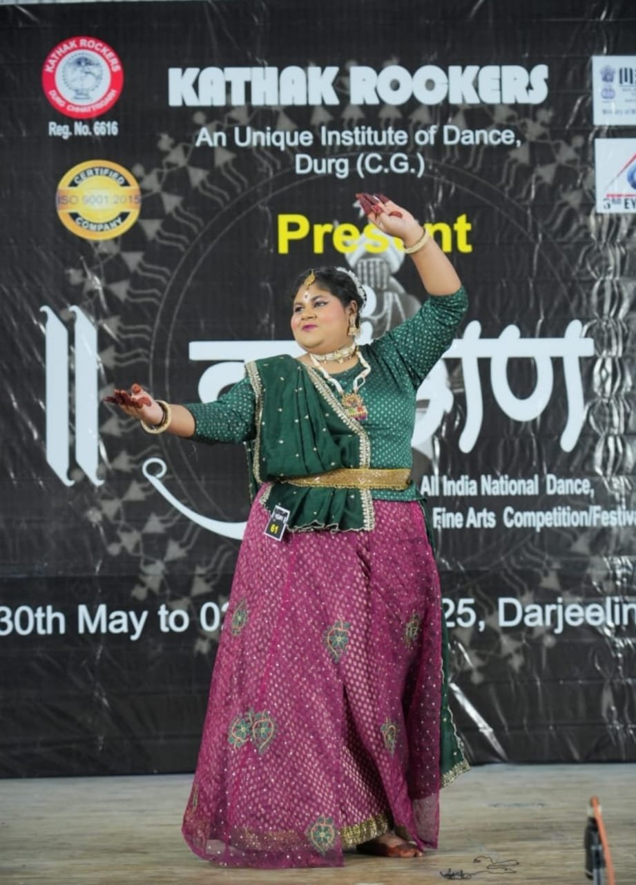 कथक एकल नृत्य, युगल, एवं ग्रुप डांस प्रतियोगिताओं में सभी वर्गों में अपनी शानदार प्रस्तुति प्रदान कर सारे दर्शक दिरगाह का मनमोहन कर छत्तीसगढ़ से बाहर पश्चिम बंगाल में छत्तीसगढ़ राजनांदगांव का नाम ऊंचा किया।