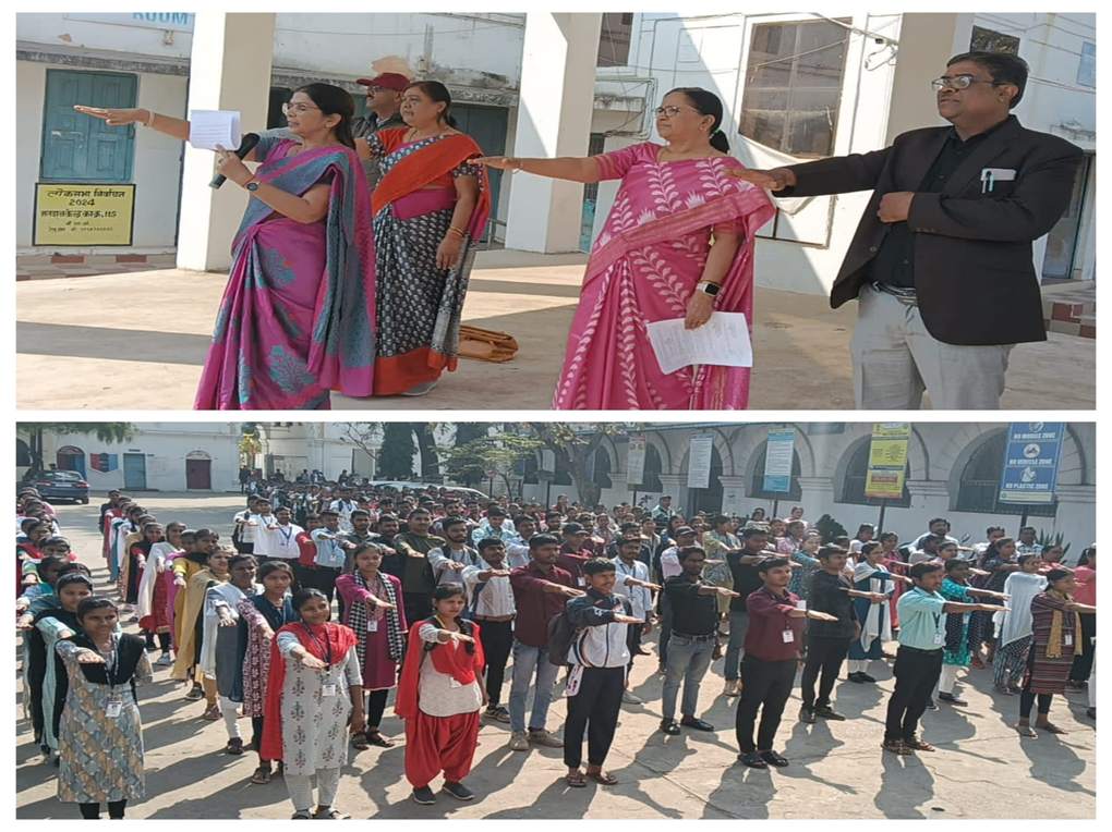 राजनांदगांव | शासकीय दिग्विजय महाविद्यालय राजनांदगांव में शासन के निर्देशानुसार प्राचार्या डॉ सुचित्रा गुप्ता द्वारा राष्ट्रीय मतदाता दिवस के उपलक्ष्य मे मतदाता शपथ दिलाई गई।ज्ञात हो कि यह 15 वाँ मतदाता दिवस है जिसका उद्देश्य यह है कि सभी नागरिक लोकतांत्रिक परम्पराओं की मर्यादा को बनाए रखने के लिए निर्वाचन की गरिमा को बढ़ावा देने व बिना किसी भेदभाव के अपने मताधिकार का प्रयोग करेंगे। उक्त अवसर पर महाविद्यालय के समस्त प्राध्यापक सहायक प्राध्यापक कर्मचारी अधिकारी एवं बड़ी संख्या मे छात्र/ छात्राओं ने मतदाता शपथ ली।यह आयोजन राजनीति विज्ञान विभाग द्वारा आयोजित किया गया था।