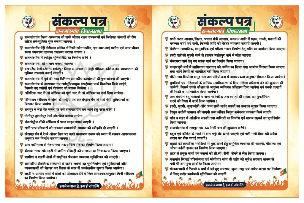 राजनंदगांव भारतीय जनता पार्टी द्वारा ध्येय वाक्य की हमने बनाया है हम ही सवारेंगे का पवित्र लक्ष्य लेकर छत्तीसगढ़ के विकास के रोड मैप को सुनियोजित प्लानिंग के साथ जनता के सामने अपने संकल्प पत्र को रखा है।