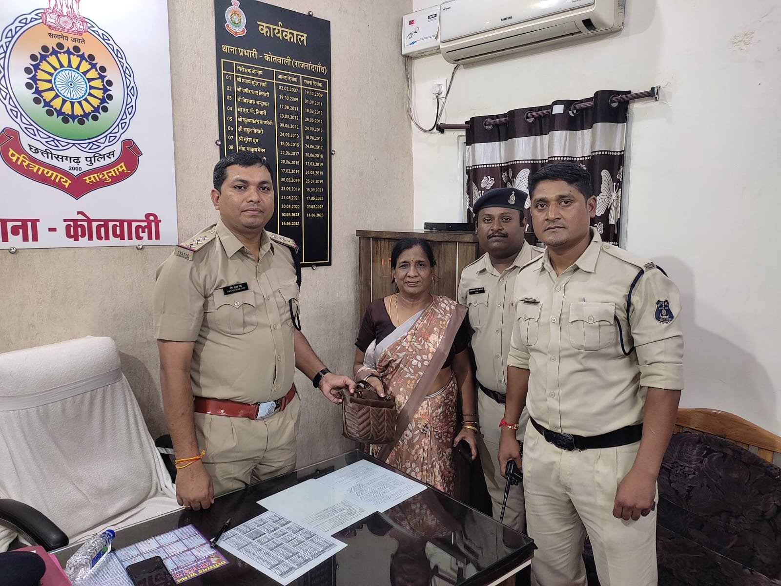 पुलिस सूत्रों से मिली जानकारी के अनुसार आज 27 अगस्त को प्रार्थियां श्रीमती कस्तुरी अग्रवाल पति अजय अग्रवाल उम्र 52 वर्ष निवासी डोंगरगांव जिला राजनांदगांव जो डोंगरगांव से बस में बैठकर राजनांदगांव आई थी। और अपने पास रखी पर्स व नगदी 25 हजार रूपये एवं 02 नग चांदी के सिक्के को पर्स सहित गुम जाने की सूचना थाना कोतवाली राजनांदगांव में आकर दी गई। प्राथियां किस बस में बैठकर राजनांदगांव पहुंची थी। उस बस की जानकारी उसे नहीं थी। कि सूचना पर थाने से तत्काल पुलिस स्टाॅफ भेजकर डोंगरगांव से राजनांदगांव आई बसों को चैक चैराहो में लगे सीसीटीव्ही के फुटेज के माध्यम से चेक करने पर उक्त महिला भदौरिया चैक के पास बस क्रमांक सी0जी0 07-एल.पी.-9529 हरिओम ट्रेवहल्स से उतरते दिखाई दी। किन्तु अपने साथ पर्स लेकर उतरते दिखाई नहीं दे रही थी। उक्त बस के कण्डेक्टर डिम्पल साहू को तलाश कर पूछताछ कर बस को चेक कराया गया तो जिस सीट पर बैठी थी, उसी सीट के नीचे महिला का पर्स गिरा हुआ था। पर्स में महिला का नगदी रकम 25 हजार रूपये व चांदी के 02 नग सिक्के सुरखित रखा था। जिसे ढुंढकर प्राथियां को सौपा गया। जिस पर प्रार्थियां द्वारा कोतवाली पुलिस की त्वरित कार्यवाही से खुश होकर सभी स्टाफ को धन्यवाद दिया गया।