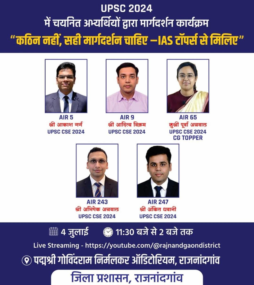 जिला प्रशासन द्वारा आयोजित इस कार्यक्रम का आयोजन 4 जुलाई 2025 को सुबह 11.30 बजे से पद्मश्री गोविंदराम निर्मलकर ऑडिटोरियम राजनांदगांव में किया गया है। कार्यक्रम में भारतीय प्रशासनिक सेवा 2024 में चयनित आकश गर्ग, आदित्य विक्रम, पूर्वा अग्रवाल, अभिषेक अग्रवाल, अंकित धबानी द्वारा जिले के युवाओं को अध्ययन के लिए आवश्यक मार्गदर्शन दिया जाएगा। कलेक्टर डॉ. सर्वेश्वर नरेन्द्र भुरे नेजिले के प्रतियोगी परीक्षाओं की तैयारी करने वाले युवाओं एवं विद्यालयों व महाविद्यालयों में अध्ययनरत विद्यार्थियों को अधिक से अधिक संख्या में उपस्थित होकर कार्यक्रम का लाभ लेने की अपील की है।