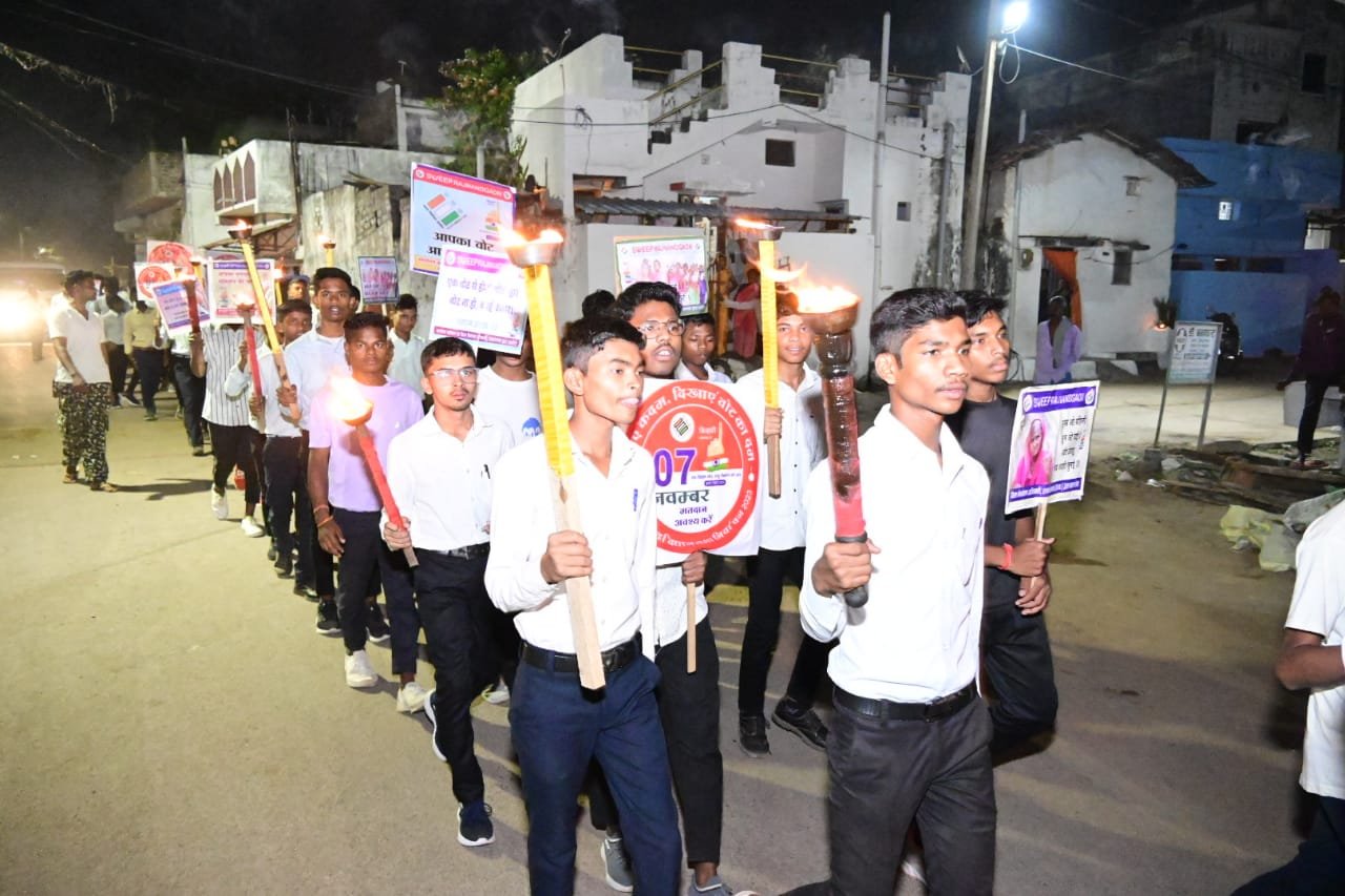मशाल रैली में युवाओं ने हम सब ने ठाना है निष्पक्ष मतदान कराना है, शत प्रतिशत मतदान बनेगा राजनांदगांव का अभिमान, 7 नवम्बर मतदान अवश्य करें, वोट डालने जाना है अपना फर्ज निभाना है, लोकतंत्र का भाग्य विधाता होता जागरूक मतदाता, वोट डालने जाएं अपना वोट काम में लाएं, वोट हमारा हैं अनमोल कभी ना लेंगे इसका मोल, आओ मिलकर अलख जगाएं शत-प्रतिशत मतदान कराएं, चुनाव आयोग का है आव्हान सबको करना है मतदान, एक वोट से होता फैसला मतदाता का यही हौसला, मतदान हमारा अधिकार है इससे बनती सरकार है का नारा लगाते हुए शत प्रतिशत मतदान का संदेश दिया गया। छात्रावास में पहुंचकर युवाओं ने निष्पक्ष मतदान करने के लिए शपथ लिया। इस अवसर पर सहायक नोडल अधिकारी स्वीप रश्मि सिंह, सहायक संचालक आदिवासी विकास दीक्षा गुप्ता, सहायक परियोजना समन्वयक मनोज मरकाम एवं अन्य अधिकारी उपस्थित थे।