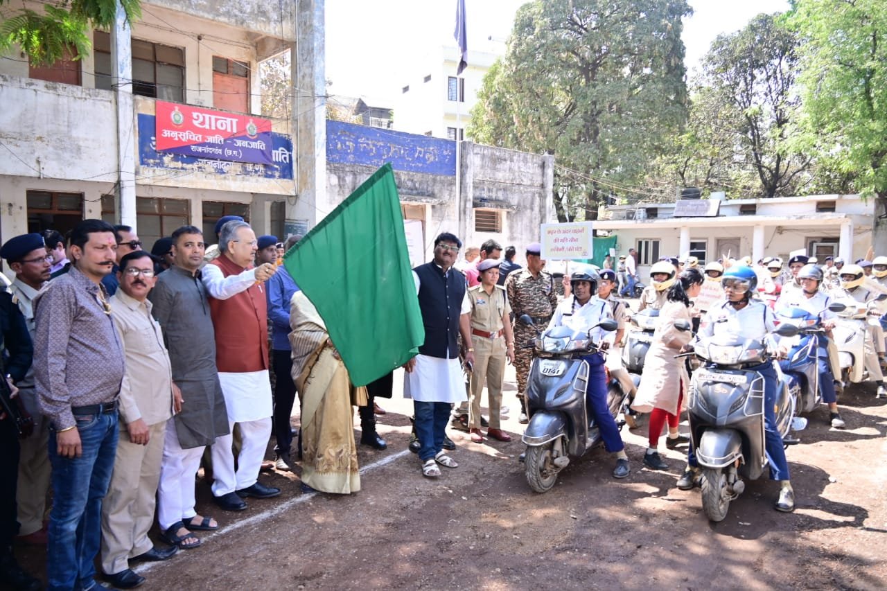 राजनांदगांव। विधानसभा अध्यक्ष डॉ. रमन सिंह ने आज अंतर्राष्ट्रीय महिला दिवस के अवसर पर महिला पुलिस कर्मियों की हेलमेट रैली को हरी झंडी दिखाकर रवाना किया। इस अवसर पर पुलिस अधीक्षक मोहित गर्ग उपस्थित रहे। सड़क सुरक्षा नियमों को जनसामान्य में संदेश देने के लिए महिला पुलिस कर्मियों ने हेलमेट पहनकर दो पहिया वाहन रैली निकाली। दो पहिया वाहन रैली अनुसूचित जाति जनजाति कल्याण (अजाक) थाना से प्रारंभ होकर पोस्ट ऑफिस चौक, भारतमाता चौक, बसंतपुर थाना तिराहा, दुर्गा चौक, मानव मंदिर चौक होते हुए गुरूद्वारा चौक, आम्बेडकर चौक से नया बस स्टैण्ड, गुरूद्वारा चौक, महावीर चौक, भगत सिंह चौक, पोस्ट ऑफिस चौक होते हुए वापस अजाक थाना पहुंचकर समापन किया गया। महिला पुलिस कर्मचारियों ने हेलमेट पहनकर सड़क सुरक्षा नियमों से लिखें तखती हाथों में लेकर जनसामान्य को संदेश दिया। रैली में दो पहिया वाहन चलाते समय स्वयं हेलमेट पहने पीछे बैठे सवारी को भी हेलमेट पहनायें, बिना लायसेंस के वाहन न चलाए, दुर्घटनाओं में घायलों को उपचार हेतु मदद करें, सड़क में अपने बाये ओर चले रोड के बीचो बीच न चले, नशे की हालत में कोई भी वाहन न चलायें, वाहन चलाते समय मोबाईल का कतई उपयोग न करें, नबालिग बच्चें को वाहन चलाने न दे, सड़क सुरक्षा जीवन रक्षा मूलमंत्र को अपनाये, सदैव यातायात नियमों का पालन करें, माल वाहक में सवारी न करें और दुर्घटना से बचे जैसे सड़क सुरक्षा नियमों की जानकारी दी गई। इस अवसर पर भावेश बैद, राजेश श्यामकर सहित पुलिस विभाग के अधिकारी-कर्मचारी उपस्थित थे।