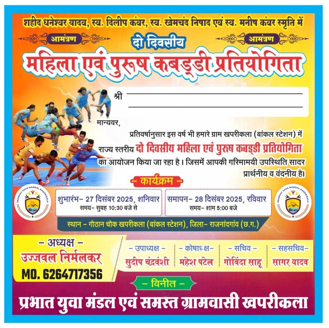 शहीद धनेश्वर यादव, स्वर्गीय दिलीप कंवर, स्वर्गीय खेमचंद निषाद एवं स्वर्गीय मनीष कंवर की स्मृति में राज्यस्तरीय दो दिवसीय महिला एवं पुरुष कबड्डी प्रतियोगिता का आयोजन 27 एवं 28 दिसंबर 2025 को किया जा रहा है।
