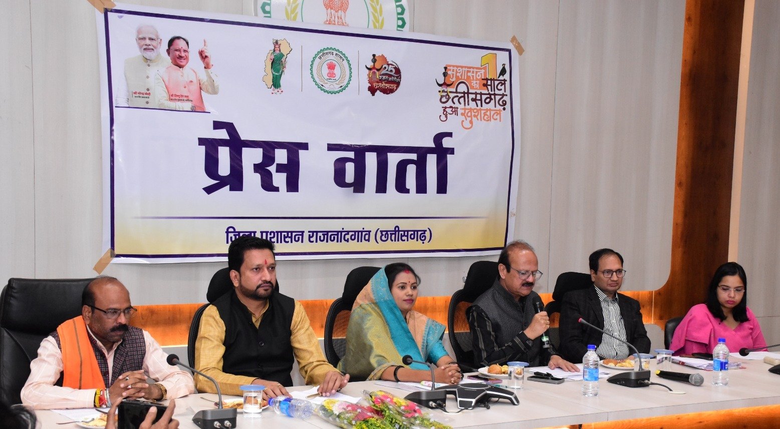 राजनांदगांव। शासन के एक वर्ष पूर्ण होने पर जनादेश परब के अवसर पर जिला पंचायत अध्यक्ष गीता साहू ने आज जिला पंचायत सभाकक्ष में प्रेस वार्ता ली। इस दौरान अध्यक्ष जिला सहकारी केन्द्रीय बैंक मर्यादित सचिन बघेल, उपाध्यक्ष जिला पंचायत विक्रांत सिंह, सभापति जिला पंचायत अशोक देवांगन, सदस्य जिला पंचायत राजेश श्यामकर, कलेक्टर संजय अग्रवाल, जिला पंचायत सीईओ सुरूचि सिंह एवं अन्य जनप्रतिनिधि, अधिकारी एवं पत्रकारगण उपस्थित थे। जिला पंचायत अध्यक्ष गीता साहू ने कहा कि मुख्यमंत्री विष्णु देव साय के नेतृत्व में छत्तीसगढ़ ने विकास के अनेक आयाम स्थापित किए हैं। सरकार ने प्रदेश के सभी वर्गों के कल्याण के लिए कार्य किया है और उपलब्धियां हासिल की है।