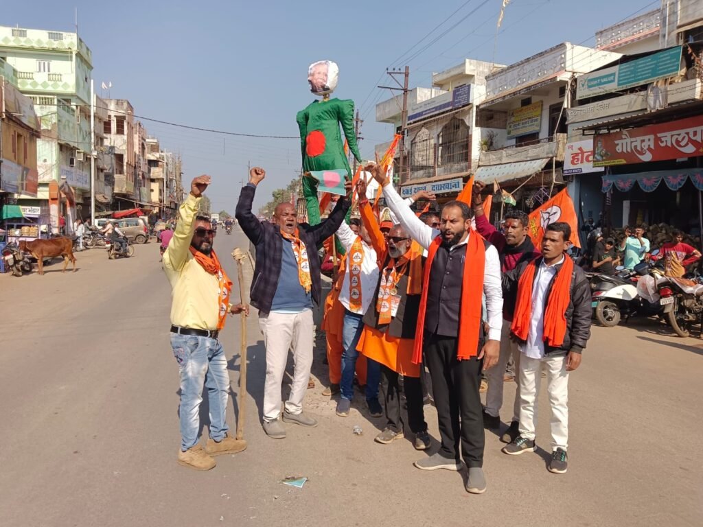 राजनांदगांव। बांग्लादेश में हिंदुओं पर हो रहे अत्याचार के विरोध में शिवसेना ने बांग्लादेश के प्रधानमंत्री मोहम्मद यूनुस का पुतला दहन किया। शहर के फौव्वारा चौक से गुरुनानक चौक तक जुलूस निकालकर पुतला फूंका गया। इसी कड़ी में डोंगरगांव के बस स्टैंड में भी शिवसैनिकों ने प्रधानमंत्री यूनुस का पुतला दहन किया।