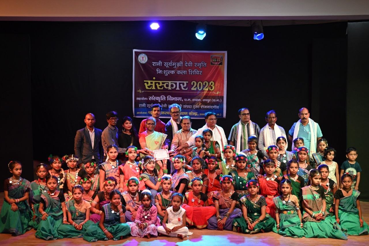 राजनांदगांव. चक्रधर कत्थक कल्याण केन्द्र द्वारा आयोजित एवं छत्तीसगढ़ संस्कृति विभाग छ.ग. शासन एवं राजगामी संपदा ट्रस्ट राजनांदगांव के सहयोग से रानी सूर्यमुखी देवी स्मृति संस्कार 2023 ग्रीष्मकालीन नि:शुल्क कला शिविर ग्रामीण मजदूर किसान एवं अन्य वर्गो के ग्रामीण युवा एवं बच्चों को नि:शुल्क कला शिविर के माध्यम से योगा, व्यक्तित्व निर्माण, संस्कार एवं शास्त्रीय कत्थक नृत्य, पारंपरिक लोक नृत्य, चित्रकला, क्राफ्ट आदि विषयों में लगभग 250 (दो सौ पचास) युवा एवं बच्चों ने कला की बारिकियों को सीखा। ज्ञात हो कि चक्रधर कत्थक कल्याण केन्द्र के संस्थापक एवं नि:शुल्क कला शिविर के संयोजक डॉ. कृष्ण कुमार सिन्हा के मार्गदर्शन में विगत तीस वर्षो से नियमित रूप से जारी है। नि:शुल्क कला शिविर का मुख्य उद्देश्य है युवाओं और बच्चों में मौलिक अभिव्यक्ति, रचनाधर्मिता और सृजनशीलता व कलात्मक रूचि पैदा करना और अपनी पुरातन कला एवं संस्कृति के प्रति रूझान पैदा हो और अपनी प्राच्यकला कि सुन्दरता एवं विशेषताओं से परिचित हो सके। संचालनालय संस्कृति एवं राजभाषा विभाग छत्तीसगढ़ शासन एवं राजगामी संपदा ट्रस्ट राजनांदगांव के सहयोग से आयोजित रानी सूर्यमुखी देवी स्मृति संस्कार नि:शुल्क कला शिविर का समापन समारोह विश्व संगीत दिवस एवं विश्व योग दिवस के अवसर पर आयोजित समापन समारोह के अतिथिगण प्रो. योगेन्द्र त्रिपाठी, अध्यक्ष निदेशक कला अकादमी छत्तीसगढ़ संस्कृति परिषद संस्कृति विभाग छ.ग.शासन, माननीय विवेक वासनिक जी अध्यक्ष राजगामी सम्पदा ट्रस्ट राजनांदगांव एवं डॉ. रेणुका गहिने जी (डीन) भारत रत्न स्व. श्री अटल बिहारी बाजपेयी स्मृति शास.चिकित्सा महाविद्यालय राजनांदगांव थे। इस अवसर पर रानी सूर्यमुखी देवी स्मृति विशिष्ट सम्मान चिकित्सा के क्षेत्र में विशिष्ट योगदान के लिए डॉ. रेणुका गहिने जी को सम्मानित किया गया। अपनी तुलिका के माध्यम से इन्द्रधनुषीय रंग भरने वाले अंतर्राष्ट्रीय चित्रकार प्रो.योगेन्द्र त्रिपाठी जी को रानी सूर्यमुखी देवी स्मृति कला रत्न सम्मान से अलंकृत किया गया। छत्तीसगढ़ी संगीत को अखिल भारतीय स्तर में पहचान दिलाने के लिए संगीत निदेशक एवं हारमोनियम वादक श्री विवेक वासनिक जी को रानी सूर्यमुखी देवी स्मृति कला रत्न सम्मान से विभूषित किया गया। छत्तीसगढ़ी नाचा एवं कला मंचों में तबला वादन के माध्यम से कला बिखेरने वाले तबला वादक श्री गणेश निषाद जी को छत्तीसगढ़ी संगीत को विश्व पटल पर स्थापित करने वाले स्व. खुमानलाल साव स्मृति सम्मान से सम्मानित किया गया। नि:शुल्क कला शिविर के प्रमुख प्रशिक्षकों में सर्वश्री अनुराग ठावरे, श्री तुषार सिन्हा, श्री डोरेश्वर शुक्ला, सुश्री ममता बघेल, श्