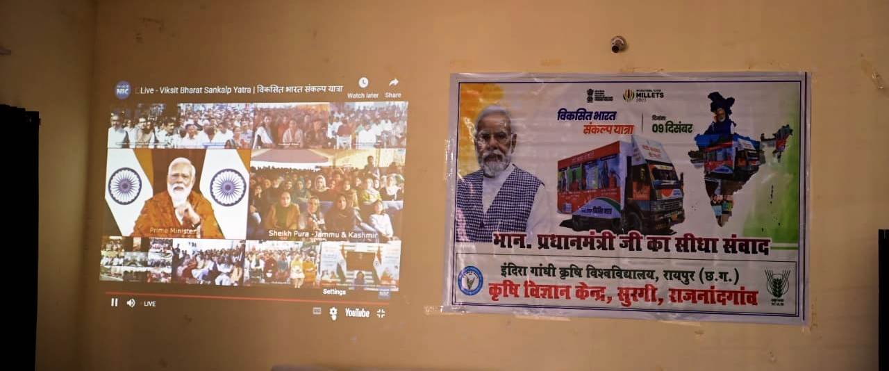 राजनांदगांव  प्रधानमंत्री नरेन्द्र मोदी ने शनिवार को विकसित भारत संकल्प यात्रा अभियान अंतर्गत जनता से सीधे संवाद कर उनसे केन्द्र शासन की विभिन्न योजनाओं के संबंध में प्रतिक्रिया ली। इस दौरान सांसद संतोष पाण्डेय, भरत वर्मा, कलेक्टर डोमन सिंह कृषि विज्ञान केन्द्र सुरगी राजनांदगांव से विडियो कान्फ्रेंसिंग के माध्यम से जुड़े रहे। इस अवसर पर सांसद संतोष पाण्डेय ने प्रधानमंत्री फसल बीमा योजना के जागरूकता रथ को हरी झण्डी दिखाकर रवाना किया।प्रधानमंत्री मोदी ने कहा कि विकसित भारत संकल्प यात्रा अभियान में हजारों लोग सहभागी बन रहे हैं और व्यापक पैमाने पर मोदी सरकार की गारंटी की गाड़ी पहुंच चुकी है। विकसित भारत संकल्प यात्रा अभियान के माध्यम से जनसामान्य को लोक कल्याणकारी योजनाओं की जानकारी दी जा रही है। उन्होंने कहा कि शासन की योजनाओं के शत-प्रतिशत पहुंच के लिए वाहन के माध्यम से दूरस्थ क्षेत्रों तक शासन के योजनाओं की जानकारी दी जा रही है। सरकार गरीब एवं वंचित लोगों के जीवन स्तर को सुधारने के लिए लगातार कार्य कर रही है। विशेषकर गरीब एवं जरूरतमंद, युवा, महिला एवं किसान को सशक्त करना है और उनके सपनों को पूरा करना है। देश के किसानों की आय बढ़ाना है और उन्हें आधुनिक कृषि को अपनाने के लिए प्रेरित करना है। सबका साथ सबका विकास की सोच के साथ गरीब एवं वंचित हितग्राहियों को लाभान्वित करना है। सरकार महिलाओं के सशक्तिकरण पर विशेष ध्यान दे रही है। गांव-गांव के स्वसहायता समूह की महिलाएं सशक्त बन रही हैं। हमें विकसित भारत का सपना पूरा करना है।सांसद पाण्डेय ने कहा कि विकसित भारत संकल्प यात्रा अभियान प्रगतिशील कृषक, व्यावसायी एवं जनसामान्य के लिए है, जिसमें वाहन के माध्यम से शासन की लोककल्याणकारी योजनाओं की जानकारी दी जाएगी। वाहन में प्रचार-प्रसार के माध्यम से किसान क्रेडिट कार्ड, स्वाईल हेल्थ कार्ड, आयुष्मान कार्ड बनाए जाएंगे और उन्हें जानकारी दी जाएगी। एक कार्यक्रम के अंतर्गत स्वास्थ्य संबंधी शिविर लगाए जाएंगे, जिसमें रक्त जांच, ब्लड प्रेशर जांच एवं चिकित्सा सुविधाएं उपलब्ध कराई जाएगी। उन्होंने कहा कि स्वास्थ्य अच्छा रहने से समृद्धि एवं खुशहाली आती है। उन्होंने सभी के सुख-शांति की कामना करते हुए देश को विकास की दिशा में आगे बढ़ाने के लिए आव्हान किया। कार्यक्रम के अंत में कृषि विज्ञान केन्द्र प्रमुख एवं वरिष्ठ कृषि वैज्ञानिक श्रीमती गुंजन झा ने आभार व्यक्त किया। इस अवसर पर जनप्रतिनिधि, अपर कलेक्टर श्रीमती इंदिरा नवीन प्रताप सिंह तोमर एवं बड़ी संख्या में कृषक उपस्थित थे।उल्लेखनीय है कि विकसित भारत संकल्प यात्रा अभियान अंतर्गत प्रधानमंत्री स्वनिधि योजना, प्रधानमंत्र