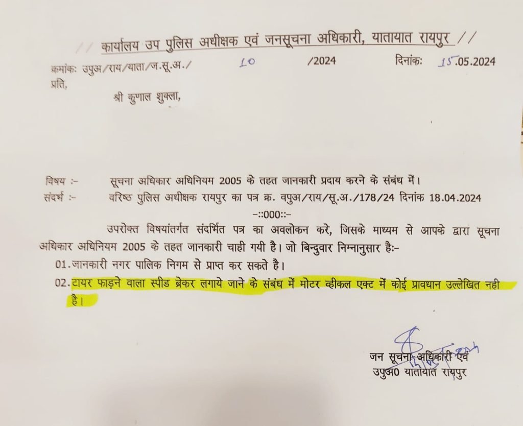 रायपुर. राजधानी रायपुर की सड़कों पर रैग साइड से आ रही गाड़ियों को रोकने के लिए ट्रैफिक पुलिस ने गाड़ियों के टायर फाड़ने वाले टायर किलर लगाए है. लेकिन अब आरटीआई से खुलासा हुआ है कि मोटर व्हीकल एक्ट में इसे लगाने का कोई भी प्रावधान नहीं है. टायर किलर कौन से मोटर व्हीकल एक्ट के तहत लगाया गया है इसके संबंध में आरटीआई कार्यकर्ता कुणाल शुक्ला ने आरटीआई लगाई थी. आरटीआई का जवाब देते हुए कार्यालय उप पुलिस अधीक्षक एवं जनसूचना अधिकारी, यातायात रायपुर ने ये बताया है कि ‘टायर फाड़ने वाले स्पीड ब्रेकर लगाए जाने के संबंध में मोटर व्हीकल एक्ट में कोई प्रावधान नहीं हैं’. कई लोगों के टायर फटे राजधानी रायपुर के एक्सप्रेस-वे समेत राजधानी के कई जगहों पर लगे टायर किलर की वजह से कई लोगों की गाड़ियों के टायर फटे. हालांकि अब ये टायर किलर कई जगहों से आधे गायब भी हो गए है और कई जगहों पर ब्रेकर में लगने वाली स्प्रिंग भी खराब हो गई है. अब सवाल ये है कि आरटीआई से खुलासे के बाद जब ये टायर किलर अवैध हो गए है तो इन्हें रायपुर ट्रैफिक पुलिस निकालती है या ये अवैध ब्रेकर ऐसे ही लगे रहेंगे ?