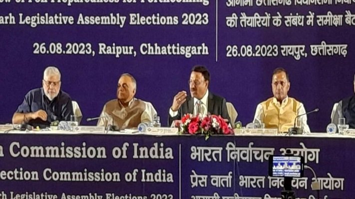 छत्तीसगढ़ विधानसभा चुनाव 2023 की तैयारी को लेकर भारत निर्वाचन आयोग की टीम तीन दिवसीय दौरे पर रायपुर पहुंची है। इस बार चुनाव का स्लोगन – वोट देहे बर जाबो जी चुनई तिहार मनाबो जी बनाया गया है। भारत निर्वाचन आयोग के मुख्य निर्वाचन आयुक्त राजीव कुमार ने शनिवार को प्रेस वार्ता में आगामी चुनाव की तैयारियों की समीक्षा की जानकारी दी। उन्होंने सभी वोटर्स को चुनाव में बढ़चढ़ कर भाग लेने का अनुरोध किया।