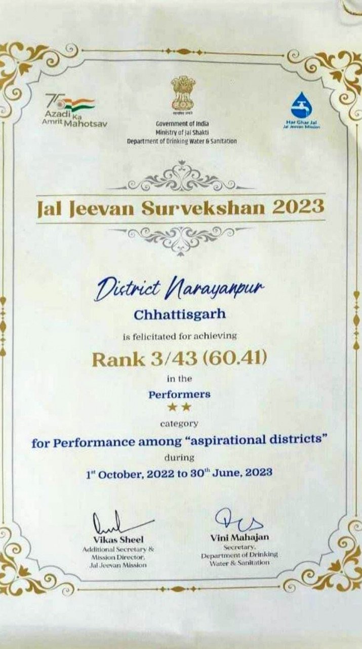 गौरतलब है कि बेहद कठिन बसाहटों वाले नारायणपुर जिले के गाँव-गाँव में हर ग्रामीण को शुद्ध पेयजल उपलब्ध कराना चुनौतीपूर्ण कार्य था। इसे सफलतापूर्वक आगे बढ़ाने के लिए केंद्र सरकार ने आंकाक्षी जिले के अंतर्गत नारायणपुर जिले को सम्मानित किया। केंद्र सरकार द्वारा जलजीवन सर्वेक्षण 1 अक्टूबर 2022 से 30 जून 2023 तक कराया गया। इसमें आकांक्षी जिलों अंतर्गत नारायणपुर जिले का कार्य उत्कृष्ट पाया गया। इस जिले के लिए जलजीवन मिशन ने 30 हजार 322 परिवारों तक शुद्ध पेयजल पहुँचाने का लक्ष्य रखा था इसमें 18 हजार 72 घरों तक नल कनेक्शन पहुँचाया जा चुका है। 14 गाँव ऐसे हैं जहां शतप्रतिशत परिवारों को कनेक्शन दिया जा चुका है।