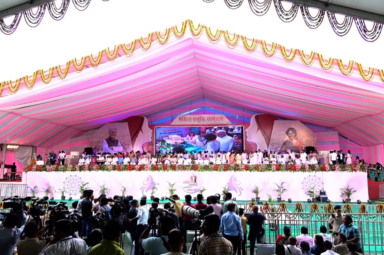 मुख्यमंत्री भूपेश बघेल और प्रियंका गांधी कार्यक्रम स्थल पहुंचेकार्यक्रम स्थल में छत्तीसगढ़ संस्कृति परंपरा के अनुसार अतिथियों का स्वागत राउत नाचा लोक नृत्य के साथ किया गयामुख्यमंत्री भूपेश बघेल और प्रियंका गांधी महिला समृद्धि सम्मेलन में लगे विभिन्न स्टॉलों का अवलोकन कर रहे हैं।छत्तीसगढ़ शासन द्वारा पशुपालन को बढ़ावा देने के लिए गोधन न्याय योजना आरंभ की गई। इसके हितग्राहियों से प्रियंका गांधी ने संवाद किया।उन्होंने महिलाओं द्वारा की जा रही आर्थिक गतिविधियों की जानकारी ली। साथ ही उन्होंने रीपा में चल रही गतिविधियों की भी जानकारी ली।उल्लेखनीय है कि रीपा के माध्यम से उद्यम के नये अवसरों को बढ़ावा मिला है और ग्रामीण क्षेत्रों में पूरी अधोसंरचना के साथ उद्योग की गतिविधियां बढ़ रही हैं। प्रियंका गांधी को अपने पास पाकर महिलाएं खुश और उत्साहित दिख रही हैं। स्व-सहायता समूह की महिलाओं को गांधी ने प्रतीक चिन्ह भेंट किया।इस अवसर पर उत्साही महिलाएं गांधी के साथ सेल्फी ले रही हैं। महिला समृद्धि सम्मेलन में अभूतपूर्व उत्साह का वातावरण बन गया है। महिलाएं अपना काम गांधी को दिखा रही हैं।वे स्टाल्स का अवलोकन कर रही हैं और एक जगह उन्होंने अमारी फूल के रस के बारे में जानकारी ली।महिलाओं ने उन्हें संक्षेप में बताया कि इसका वे किस तरह उपयोग करती हैं।