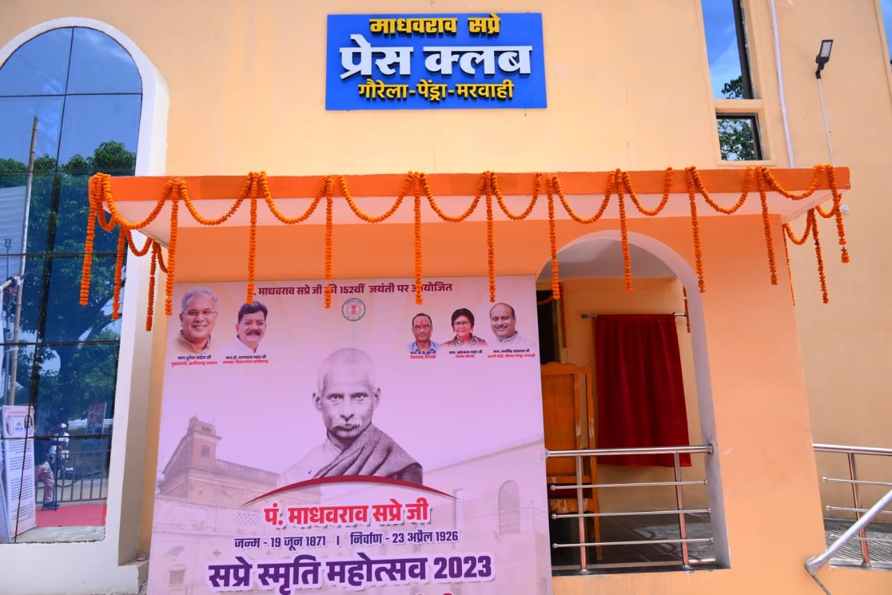 मुख्यमंत्री पहुँचे पेंड्रा प्रेस क्लब, यहां उन्होंने 50 लाख रुपए की लागत से बने प्रेस क्लब भवन सह वाचनालय का किया लोकार्पण, 50 लाख रुपए की लागत से बने इस भवन से स्थानीय पत्रकारों को होगी सुविधा। स्कूली विद्यार्थियों और प्रतियोगी परीक्षाओं की तैयारी कर रहे युवाओं को वाचनालय का मिलेगा लाभ। मुख्यमंत्री ने यहां स्वर्गीय पंडित माधवराव सप्रे की प्रतिमा का अनावरण भी किया। दो लाख रुपए की लागत से बनी इस प्रतिमा का अनावरण सप्रे जी की 152 वीं जयंती के अवसर पर किया गया है। इस अवसर पर यहाँ पंडित माधव राव सप्रे स्मृति महोत्सव का भी आयोजन किया जा रहा है। महोत्सव में देश-प्रदेश के जाने-माने साहित्यकार और वरिष्ठ पत्रकार भी शामिल हो रहे है