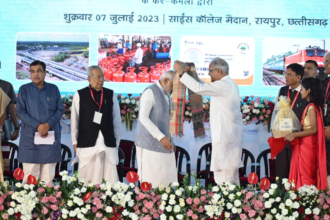मुख्यमंत्री श्री भूपेश बघेल ने प्रधानमंत्री जी को स्मृति चिन्ह के रूप छत्तीसगढ़ के कारीगरों द्वारा तैयार अंगवस्त्र और मिलेट्स की टोकरी भेंट की.