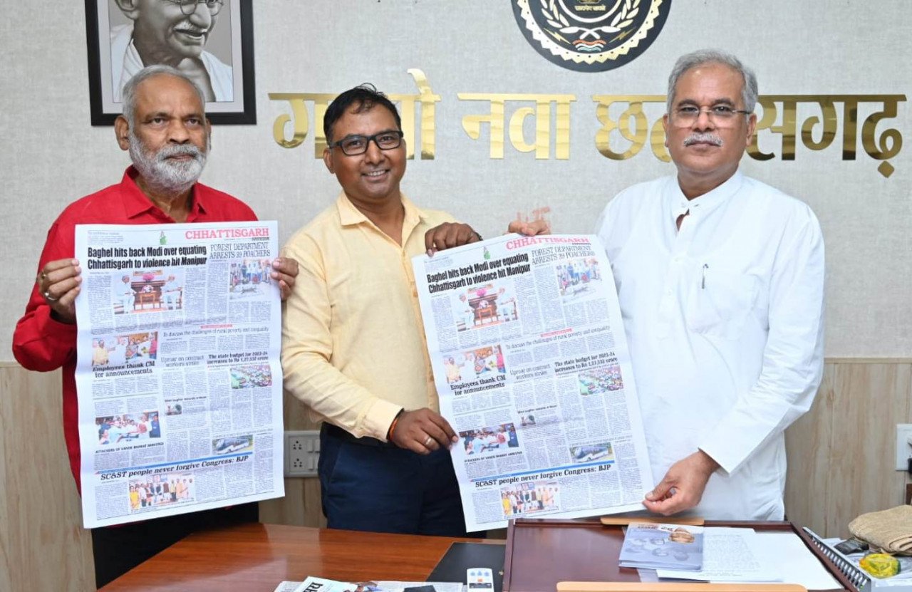 मुख्यमंत्री भूपेश बघेल ने आज यहां अपने निवास कार्यालय में राष्ट्रीय अंग्रेजी दैनिक ‘‘दी फ्री प्रेस जर्नल’’ के छत्तीसगढ पेज का विमोचन किया। इस दौरान राष्ट्रीय अंग्रेजी दैनिक दी फ्री प्रेस जर्नल के राज्य संवाददाता अवधेश कुमार मलिक ने बताया कि छत्तीसगढ़ पेज का नियमित प्रकाशन किया जाएगा। इस पेज के प्रकाशन का मुख्य उद्देश्य छत्तीसगढ़ में साढ़े चार वर्षों में हुए कार्य और प्रगति को पूरे विश्व के पटल पर लाना है। मुख्यमंत्री ने इस अवसर पर तोमर और मलिक को बधाई और शुभकामनाएं दी।