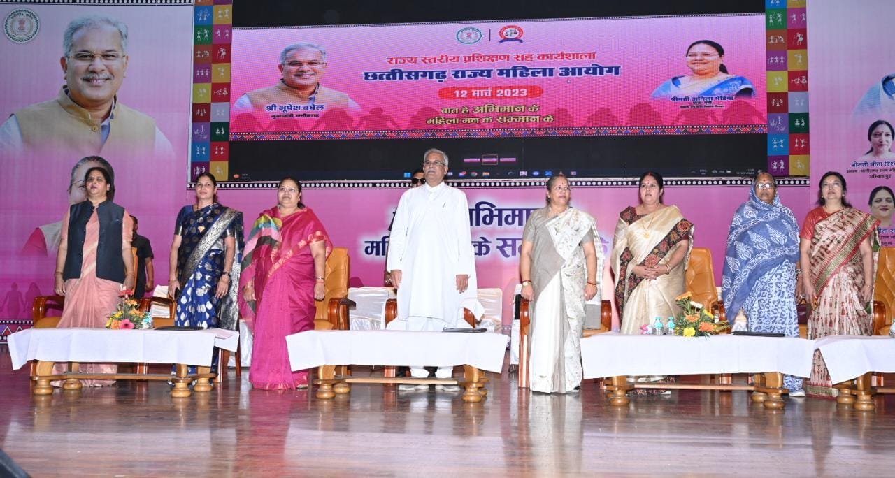 मुख्यमंत्री भूपेश बघेल ने छत्तीसगढ़ राज्य महिला आयोग द्वारा आयोजित विधिक जागरूकता प्रशिक्षण शिविर सह कार्यशाला का छत्तीसगढ़ महतारी के छायाचित्र पर माल्यार्पण, दीप प्रज्वलन एवं राज्यगीत के साथ शुभारंभ किया।