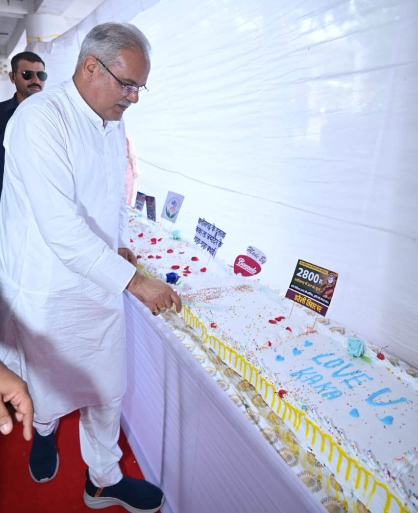 मुख्यमंत्री श्री भूपेश बघेल ने अपने जन्मदिन के अवसर पर मल्टीलेवल पार्किंग में डेढ़ सौ फीट की लंबाई वाला केक काटा।
