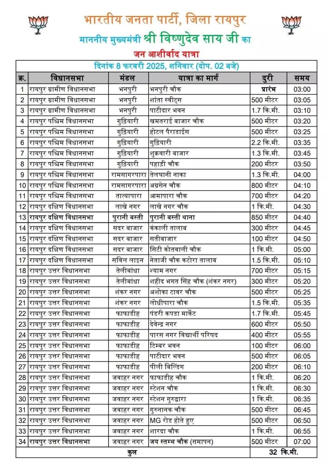 रायपुर। सीएम विष्णुदेव साय की जन आशीर्वाद यात्रा 8 फरवरी को राजधानी रायपुर के 70 वार्डो से गुजरेगी यह यात्रा दोपहर 3.30 बजे भनपुरी चौक से आरंभ होकर जय स्तंभ चौक में रात्रि 7.00 बजे समाप्त होगी। लगभग 32 किलोमीटर की जन आशीर्वाद यात्रा में नगरीय निकाय चुनाव में भाजपा का कमल खिलाने की अपील करेंगे। इस यात्रा में महापौर पद की प्रत्याशी मिनल चौबे और 70 वार्डो से बीजेपी प्रत्याशी के साथ साथ बीजेपी कार्यकर्ता सम्मिलित होंगे।
