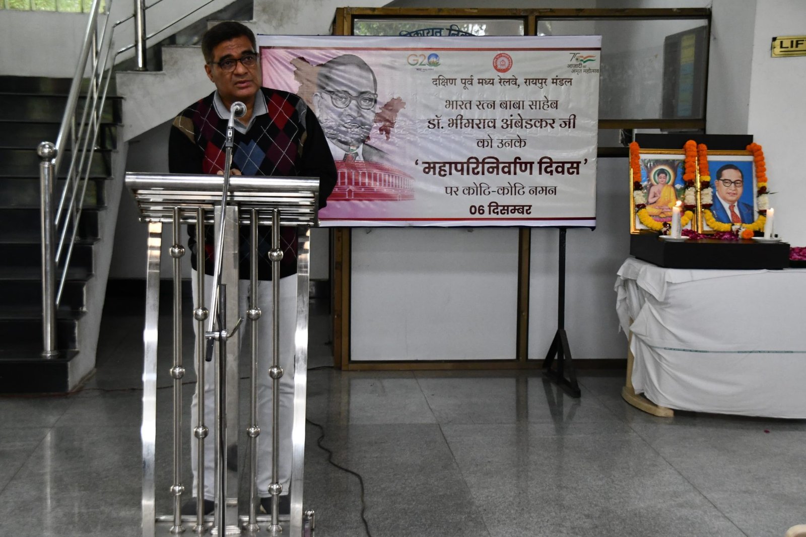 रायपुर। दक्षिण पूर्व मध्य रेलवे, रायपुर मंडल द्वारा संविधान निर्माता, भारत रत्न डॉ. बाबा साहेब भीम राव अम्बेडकर के महापरिनिर्वाण दिवस पर मंडल रेल प्रबंधक संजीव कुमार, अपर मंडल रेल प्रबंधक (इंफ़्रा) आशीष मिश्रा, अपर मंडल रेल प्रबंधक (परिचालन) आर के साहू, अनुसूचित जाति एवं जनजाति अखिल भारतीय रेलवे कर्मचारी एशोसिएशन के डिविजनल प्रेसिडेन्ट भोली चौधरी, मंडल सचिव श्री वाय के मिहुलिया, मंडल कार्मिक अधिकारी (प्रभारी) राहुल गर्ग सहित सभी विभागों के संबंधित अधिकारी एवं कर्मचारियों द्वारा भारत रत्न डॉ. भीम राव अम्बेडकर व भगवान बुद्ध के चित्रों पर श्रद्धांजली स्वरूप श्रद्धा सुमन अर्पित किये गये।इस अवसर पर अनुसूचित जाति एवं जनजाति अखिल भारतीय रेलवे कर्मचारी एशोसिएशन पदाधिकारी के द्वारा बुद्ध वंदना की गई, सभी कर्मचारी संगठनों के पदाधिकारियों ने भारत रत्न डॉ. बाबा साहेब भीम राव अम्बेडकर जी के जीवन से संबंधित विषयों एवं उनकी प्रखर मेधा एवं दूरदर्शिता पर प्रकाश डाला ।मंडल रेल प्रबंधक संजीव कुमार ने भारतरत्न बाबासाहेब डॉ. भीमराव अंबेडकर जी के महापरिनिर्वाण दिवस पर कहा कि बाबासाहेब अम्बेडकर बहूआयामी व्यक्तित्व के धनी थे । हम सभी भारतीय रेल के लिए समर्पित भाव से कार्य करें हमको मिले उत्तरदायित्व का कर्तव्य परायण ही महापुरुषों के प्रति सच्ची श्रद्धांजलि होगी।इस अवसर पर मंडल रेल प्रबंधक ने रायपुर रेल मंडल के यात्री परिवहन, माल परिवहन एवं महिला सुरक्षा में उत्कृष्ट भूमिका के लिए सभी रेल अधिकारीयों एवं रेल कर्मियों की हौसला अफजाई कर विभिन्न विभागों के कार्यों की प्रशंसा की। इस कार्यक्रम का धन्यवाद ज्ञापन मंडल कार्मिक अधिकारी (प्रभारी) राहुल गर्ग द्वारा किया।