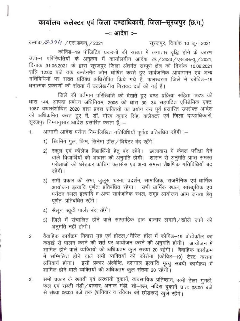 सूरजपुर | कोविड-19 पॉजिटिव प्रकरणों की संख्या में लगातार वृद्धि होने के कारण उत्पन्न परिस्थितियों के अनुक्रम में जिला अंतर्गत सम्पूर्ण क्षेत्र को 10 जनू 2021 रात्रि 12.00 बजे तक कन्टेनमेंट जोन घोषित करते हुए सार्वजनिक आवागमन एवं अन्य गतिविधियों पर सख्त प्रतिबंध अधिरोपित किये गये हैं, फलस्वरूप जिले में कोविड-19 धनात्मक प्रकरणों की संख्या में उल्लेखनीय गिरावट दर्ज की गई है जिसको देखते हुए कलेक्टर एवं जिला दण्डाधिकारी डॉ. गौरव कुमार सिंह आदेश जारी किया है जिसमें निम्न गतिविधियाँ पूर्णत: प्रतिबंधित रहेंगी जैसे- स्विमिंग पुल, जिम, सिनेमा हॉल, थियेटर बंद रहेंगे। स्कूल एवं कॉलेज विद्यार्थियों हेतु बंद रहेंगे। छात्रावास में केवल परीक्षा देने वाले विद्यार्थियों को आवास की अनुमति होगी। शासन से अनुमति प्राप्त समस्त परीक्षाओं को छोड़कर कोचिंग क्लासेस एवं अन्य समस्त शैक्षणिक गतिविधियाँ बंद रहेंगी।  सभी प्रकार की सभा, जुलूस, धरना प्रदर्शन, सामाजिक, राजनैतिक एवं धार्मिक आयोजन इत्यादि पूर्णत: प्रतिबंधित रहेगा। सभी धार्मिक स्थल, सांस्कृतिक एवं पर्यटन स्थल इत्यादि व अन्य सार्वजनिक स्थल समूह आयोजन आम जनता हेतु पूर्णत: प्रतिबंधित रहेंगे। सैलून, ब्यूटी पार्लर बंद रहेंगे। जिले में संचालित होने वाले साप्ताहिक हाट बाजार लगाने, खोले जाने की अनुमति नहीं होगी। यह आदेश दिनांक 10 जून 2021 रात्रि 12.00 बजे से लागू होगा।जारी आदेश में कहा गया हैं कि वैवाहिक कार्यक्रम निवास गृह एवं होटल, मैरिज हॉल में कोविड-19 प्रोटोकॉल का कड़ाई से पालन करने की शर्त पर आयोजन करने की अनुमति होगी। आयोजन में शामिल होने वाले व्यक्तियों की अधिकतम कुल संख्या 20 रहेगी। वैवाहिक कार्यक्रम में सम्मिलित होने वाले सभी व्यक्तियों को कोरोना (कोविड-19) टेस्ट कराना अनिवार्य होगा। इसी प्रकार अंत्येष्टि, दशगात्र इत्यादि मृत्यु संबंधी कार्यक्रम में शामिल होने वाले व्यक्तियों की अधिकतम कुल संख्या 20 रहेगी