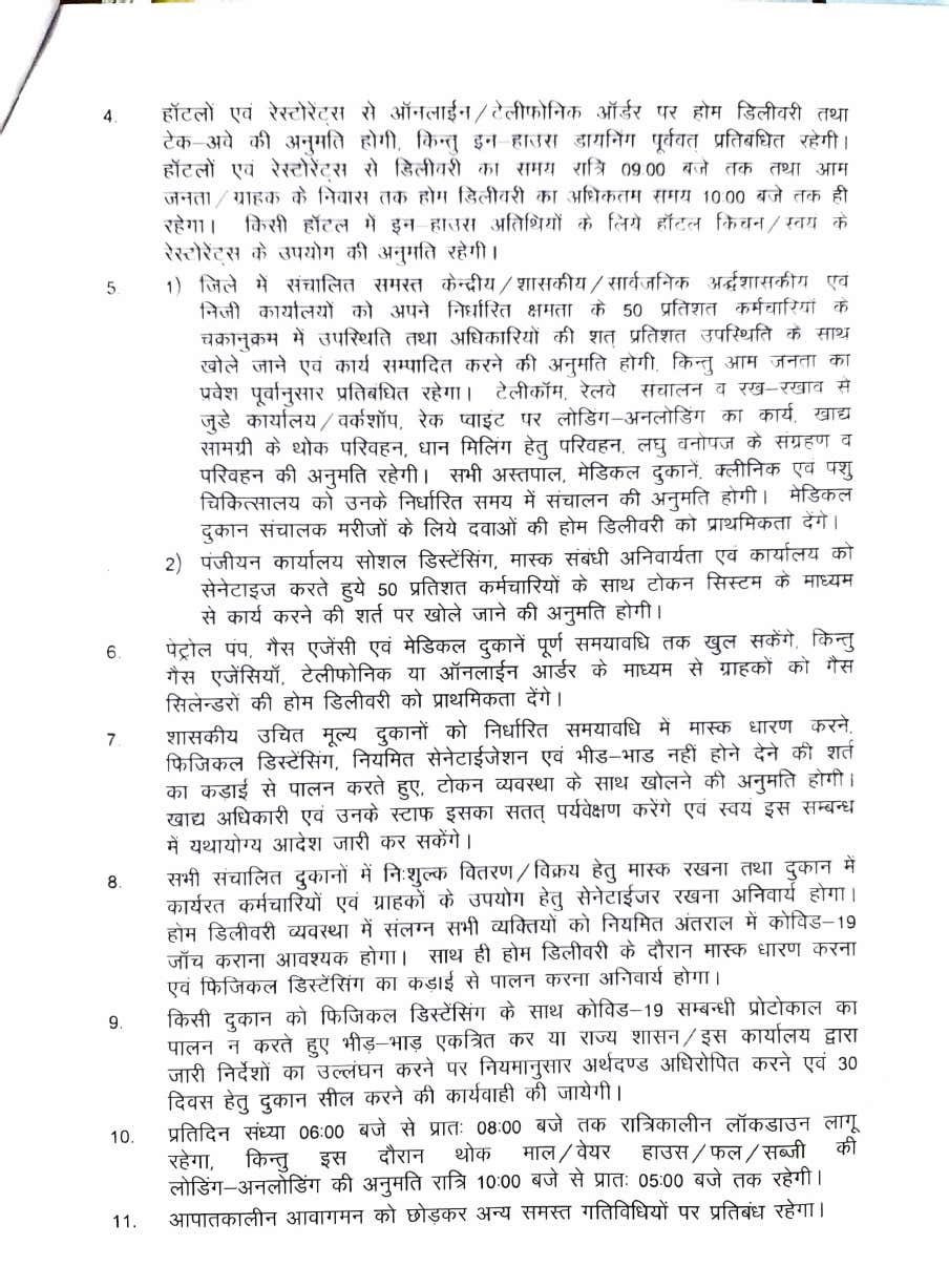 सभी प्रकार के स्थायी एवं अस्थायी दुकानें, व्यवसायिक प्रतिष्ठान, सभी ठेला गुमटी, फल एवं सब्जी मंडी, बाजार, अनाज मंडी, शो-रूम, मदिरा दुकानें प्रात: 08.00 बजे से संध्या 06.00 बजे तक (शनिवार व रविवार को छोड़कर) खुले रहेंगे।हॉटलों एवं रेस्टोरेंटस से ऑनलाईन, टेलीफोनिक ऑर्डर पर होम डिलीवरी तथा टेक अवे की अनुमति होगी, किन्तु इन हाउस डायनिंग पूर्ववत प्रतिबंधित रहेगी। हॉटलों एवं रेस्टोरेट्स से डिलीवरी का समय रात्रि 09.00 बजे तक तथा आम जनता, ग्राहक के निवास तक होम डिलीवरी का अधिकतम समय 10.00 बजे तक ही रहेगा। किसी होटल में इन हाउस अतिथियों के लिये हॉटल किचन या स्वयं के रेस्टोरेंट्स के उपयोग की अनुमति रहेगी। जिले में संचालित समस्त केन्द्रीय, शासकीय, सार्वजनिक अद्र्धशासकीय एवं निजी कार्यालयों को अपने निर्धारित क्षमता के 50 प्रतिशत कर्मचारियों के चक्रानुक्रम में उपस्थिति तथा अधिकारियों की शत प्रतिशत उपस्थिति के साथ खोले जाने एवं कार्य सम्पादित करने की अनुमति होगी, किन्तु आम जनता का प्रवेश पूर्वानुसार प्रतिबंधित रहेगा। टेलीकॉम, रेलवे संचालन व रख-रखाव से जुड़े कार्यालय, वर्कशॉप, रेक प्वांइट पर लोडिंग-अनलोडिंग का कार्य खाद्य सामग्री के थोक परिवहन, धान मिलिंग हेतु परिवहन, लघु वनोपज के संग्रहण व परिवहन की अनुमति रहेगी। सभी अस्तपाल मेडिकल दुकानें, क्लीनिक एवं पशु चिकित्सालय को उनके निर्धारित समय में संचालन की अनुमति होगी। मेडिकल दुकान संचालक मरीजों के लिये दवाओं की होम डिलीवरी को प्राथमिकता देंगे। पंजीयन कार्यालय सोशल डिस्टेंसिंग मास्क संबंधी अनिवार्यता एवं कार्यालय को सेनेटाइज करते हुये 50 प्रतिशत कर्मचारियों के साथ टोकन सिस्टम के माध्यम से कार्य करने की शर्त पर खोले जाने की अनुमति होगी।
