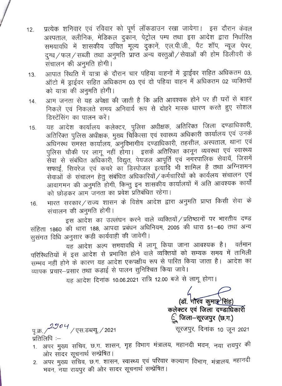 प्रतिदिन संध्या 06.00 बजे से प्रात: 08.00 बजे तक रात्रिकालीन लॉकडाउन लागू रहेगा, किन्तु इस दौरान थोक माल, वेयर हाउस, फल, सब्जी की लोडिंग-अनलोडिंग की अनुमति रात्रि 10.00 बजे से प्रात: 05.00 बजे तक रहेगी। आपातकालीन आवागमन को छोड़कर अन्य समस्त गतिविधियों पर प्रतिबंध रहेगा।  प्रत्येक शनिवार एवं रविवार को पूर्ण लॉकडाउन रखा जायेगा। इस दौरान केवल अस्पताल, क्लीनिक मेडिकल दुकान पेट्रोल पम्प तथा इस आदेश द्वारा निर्धारित समयावधि में शासकीय उचित मूल्य दुकानें, एल.पी.जी.,पैट शॉप न्यूज पेपर, दुग्ध, फल, सब्जी तथा अनुमति प्राप्त अन्य वस्तुओ, सेवाओं की होम डिलीवरी के संचालन की अनुमति होगी।  आपात स्थिति में यात्रा के दौरान चार पहिया वाहनों में ड्राईवर सहित अधिकतम 03, ऑटो में ड्राईवर सहित अधिकतम 03 एवं दो पहिया वाहन में अधिकतम 02 व्यक्तियों को यात्रा की अनुमति होगी।आम जनता से यह अपेक्षा की जाती है कि अति आवश्यक होने पर ही घरों से बाहर निकलें एवं निकलते समय अनिवार्य रूप से दोहरे मास्क धारण करते हुए सोशल डिस्टेंसिंग का पालन करें। इस आदेश का उल्लंघन करने वाले व्यक्तियों, प्रतिष्ठानों पर भारतीय दण्ड संहिता 1860 की धारा 188 आपदा प्रबंधन अधिनियम, 2005 की धारा 51-60 तथा अन्य सुसंगत विधि अनुसार कड़ी कार्यवाही की जावेगी।