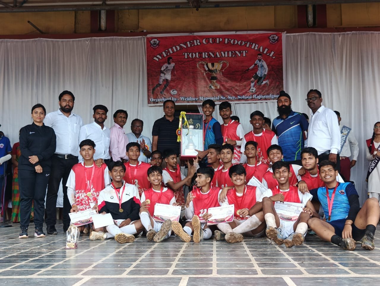 राजनांदगांव। नगर की गौरवशाली शिक्षण संस्था वाईडनर स्कूल द्वारा आयोजित वाईडनर कप फुटबॉल स्पर्धा का आज समापन समारोह मुख्य अतिथि श्री देवेन्द्र सिंह ठाकुर (जिला खेल अधिकारी), शाला के मैनेजर फॉदर जोसेफ राज, प्राचार्य फॉदर टी.अमलासीलन के करकमलों से किया गया आज का फाइनल मैच वाईडनर स्कूल विरुद्ध रॉयल किड्स स्कूल के मध्य खेला गया, यह मैच बहुत ही संघर्ष पूर्ण मैच रहा दोनों ही टीम पहले हाफ में बराबर पर रही, दूसरे हॉफ का खेल शुरू होने के बाद 55वे मिनट में वाईडनर के दुष्यंत गोखे ने शानदार हेडिंग से गोल दागा जिसे जय मंधानी द्वारा एसिस्ट किया गया, इस शानदार गोल से वाईडनर स्कूल ने 1 गोल से यह मैच जीत कर वाईडनर कप पर कब्जा किया, विजेता टीम को और उपविजेता टीम को शानदार ट्रॉफी से नवाजा गया, इस स्पर्धा का बेस्ट गोल कीपर का खिताब वाईडनर स्कूल के कृष्णा कटके को दीया गया, प्लेयर ऑफ द टूर्नामेंट का खिताब वाईडनर स्कूल के प्रखर सिंग राजपूत को दीया गया, बेस्ट फारवर्ड का खिताब रॉयल किड्स स्कूल के निकेश पोयाम को दीया गया, बेस्ट डिफेंस का खिताब रॉयल किड्स स्कूल के चिन्मय राव को दीया गया, इस फाइनल मैच के निर्णायक दीपेश डे लाइन मैन अंकित और योगेन्द्र थे, विजेता टीम के सभी खिलाड़ियों एवम उनके कोच डेनियल फ्रांसिस,तरनदीप अरोरा, राजेश निर्मलकर, शिल्पा वैष्णव, विनीत रंजन को शाला परिवार की ओर से बहुत बहुत बधाई दी गई,यह जानकारी स्पर्धा के संयोजक डेनियल फ्रांसिस और सौरभ हरिहारनो ने दी।
