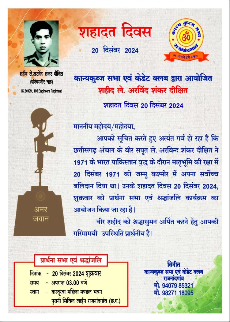 कान्यकुब्ज सभा एवं कैडेट क्लब राजनांदगॉव संयुक्त आयोजन में शहीद अरविन्द शंकर दीक्षित को देंगे श्रद्धांजलि