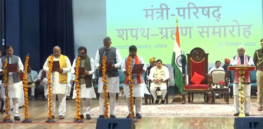 मध्य प्रदेश के राज्यपाल मंगुभाई पटेल राजभवन में मंत्रियों को पद और गोपनीयता की शपथ दिलवा रहे हैं। राज्यपाल ने सबसे पहले विजय शाह, कैलाश विजयवर्गीय, पहलाद सिंह पटेल, राकेश सिंह, करण सिंह वर्मा और राव उदय प्रताप सिंह को मंत्री पद की शपथ दिलाई।