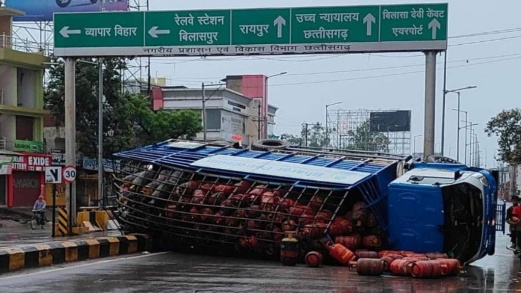 CG : सिलेंडरों से भरा ट्रक पलटा, सड़क पर बिखरे गैस सिलेंडर, बड़ा हादसा टला