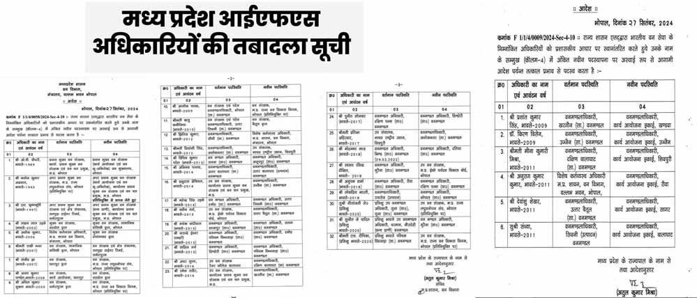 यह तबादले 16 जिलों में किये गए है। जिसमे खरगोन, उज्जैन, बैतूल, सिवनी, सीधी, अशोक नगर, सतना, बालाघाट, दमोह, शाजापुर पन्ना, भिंड, मुरैना, रीवा, रायसेन और भोपाल जिले के वन मंडल अधिकारी (DFO) बदले गए हैं।जिसकी सूची प्रशासन द्वारा जारी कर दी गई है। इसमें भोपाल के डीएफओ आलोक पाठक का भी तबादला किया गया है। पाठक की जगह लोकप्रिय भारती को भोपाल का वन मंडलाधिकारी बनाया गया है।