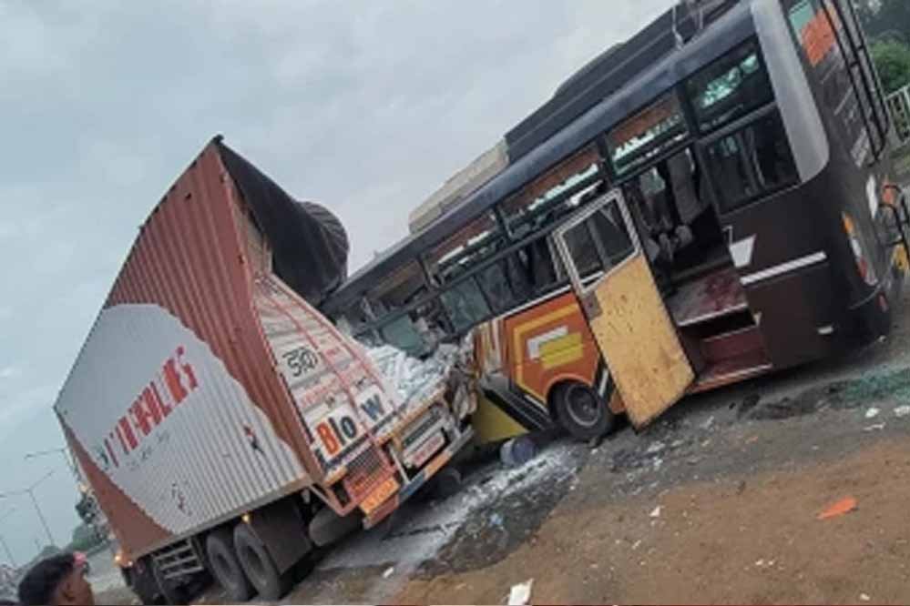 कंटेनर से टकराने के बाद बस तिरछी होकर फंस गई।