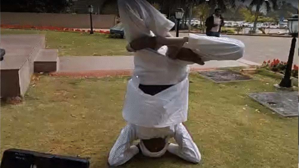 अपने बयानों और अनोखे अंदाज के लिए चर्चा में रहने वाले श्योपुर विधायक बाबूलाल जंडेल ने आज मध्य प्रदेश विधानसभा परिसर में हलचल मचा दी. खुद पर हुई पुलिसिया कार्रवाई को राजनीति से प्रेरित बताते हुए जंडेल ने गांधी प्रतिमा के सामने शीर्षासन कर अपना विरोध दर्ज कराया.