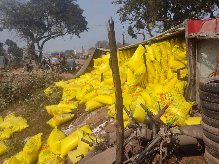घने कोहरे के कारण फोरलेन से टू लाईन पर उतरते ही पुलिया के पास तेज घना कोहरा छाया गया एम पी 36 एच 0873 ट्रक के चालक को आगे की रोड़ नहीं दिखी ट्रक चालक पुष्पेंद्र शिवहरे खैरी ने जोरदार ब्रेक लगा दिया ट्रक का संतुलन बिगड़ा ट्रक पलट गया ट्रक में 690 यूरिया खाद की बोटी लदी हुई थी यूरिया खाद की बोरिया खदान में बिखर गई घटना सुबह साढ़े सात बजे की है