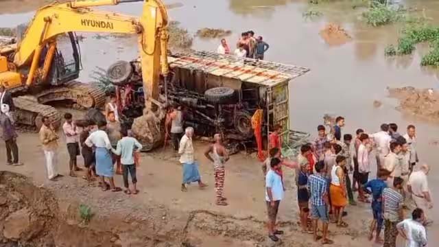 बता दें दुरसड़ा थाना क्षेत्र के ग्राम बुहारा के पास बन रहे पुल के कारण नदी पर रपटा बनाकर निकाला जा रहा था। जहां से मिनी ट्रक निकल रहा था। ट्रक अनियंत्रित होकर नदी में जा गिरा जिससे कई लोगों की मौत हो गई। मिनी ट्रक में सवार लोग ग्वालियर के बिलहेटी गांव से टीकमगढ़ के जतारा एक शादी समारोह में शामिल होने जा रहे थे। तभी बुहारा गांव के पास निर्माणाधीन पुल के पास गाड़ी पलटने से हुआ हादसा। दतिया पुलिस अधीक्षक प्रदीप शर्मा मौके पर पहुंच गए हैं और रेस्क्यू कार्य जारी है।